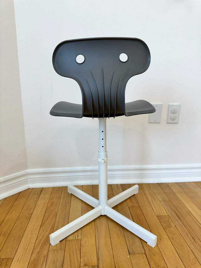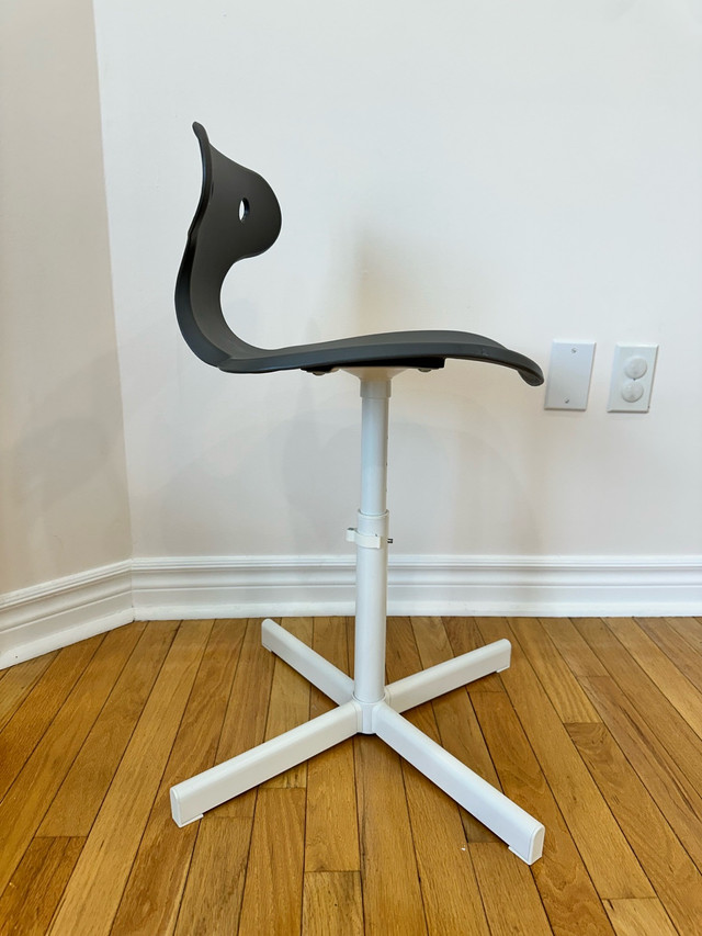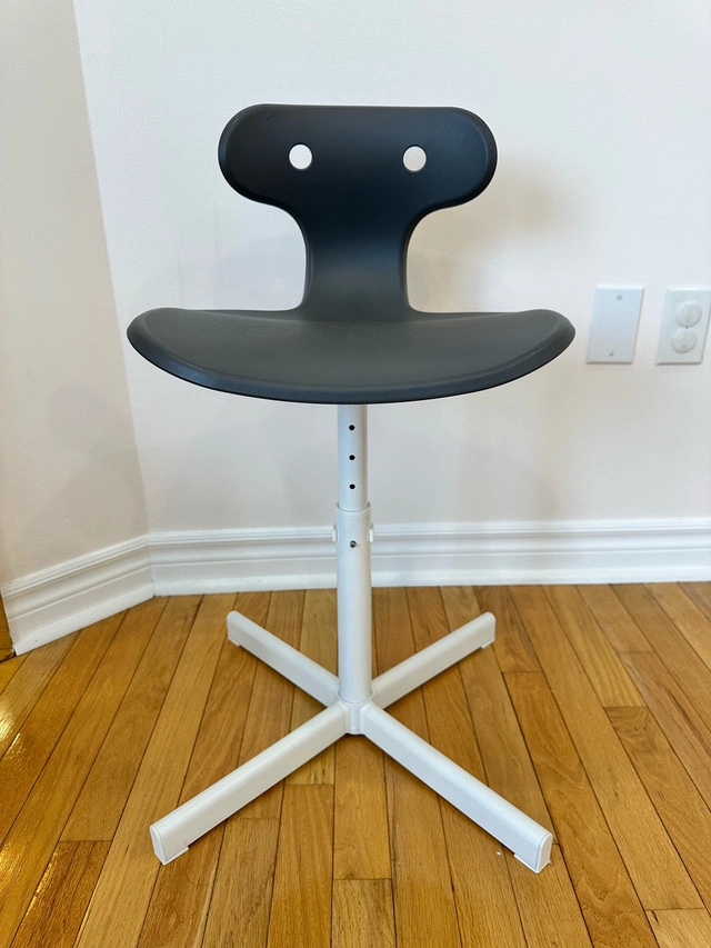 These two discontinued grey and white IKEA stools are perfect for children, offering an adjustable height for growing kids. These stools have a sturdy build and are in good condition, ready for a new home. Their unique design adds a touch of modern style to any room.