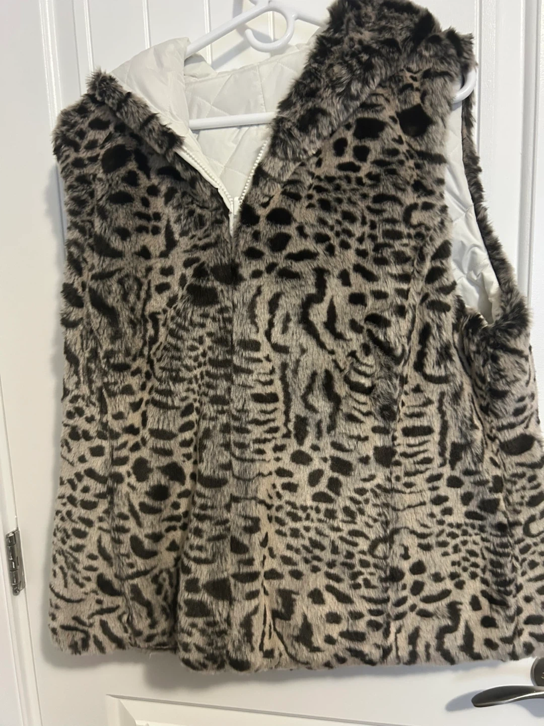 73Snuggle up in this fun faux fur vest! It's got a cool leopard print and a comfy hood. Perfect for layering on those chilly days!
