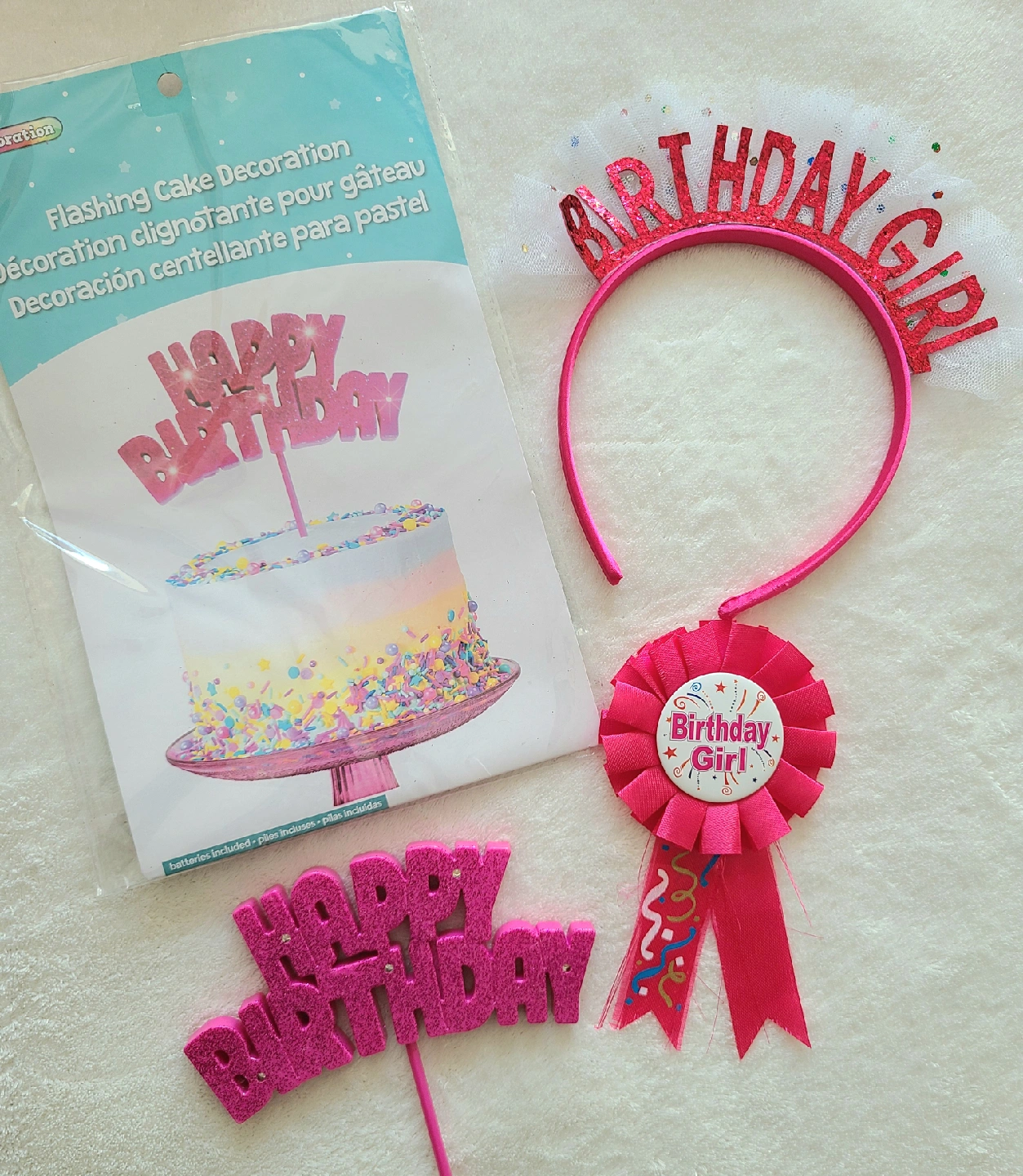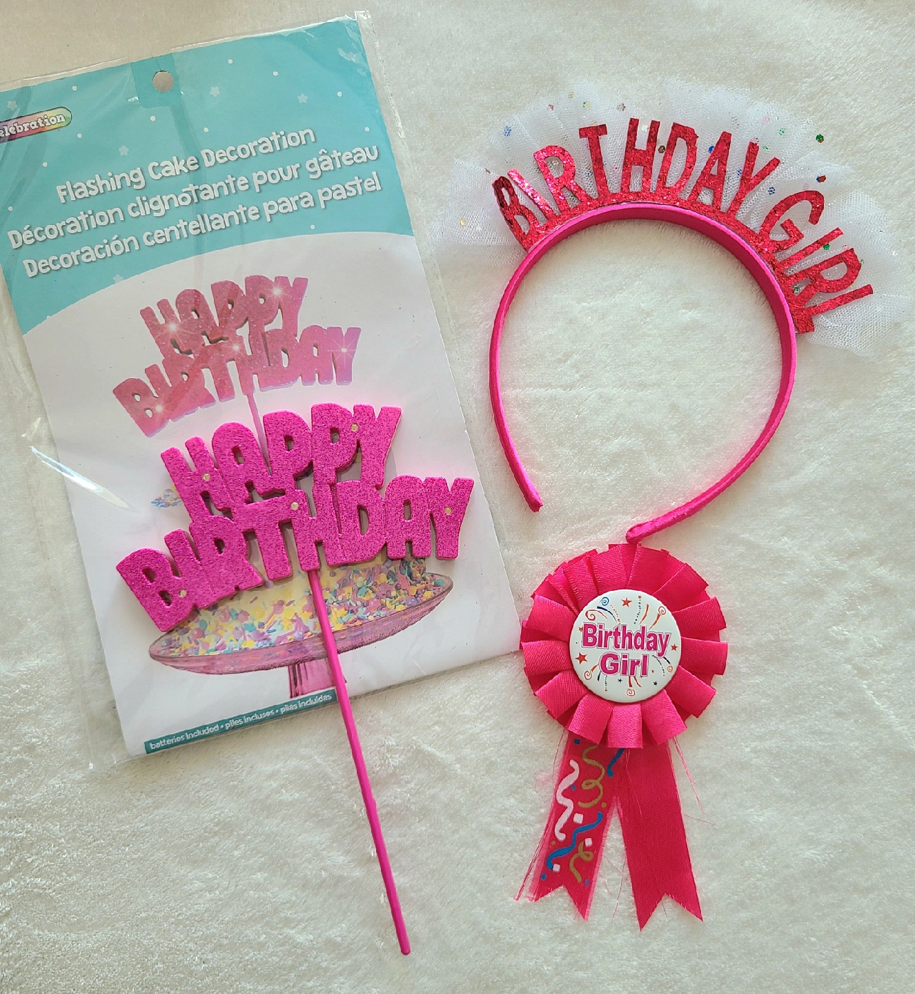 153Perfect for a birthday celebration. The headband is pink with white tulle and sparkly red lettering. The rosette is also pink with a 'Birthday Girl' button and colourful ribbons. Flashing Cake Decoration.