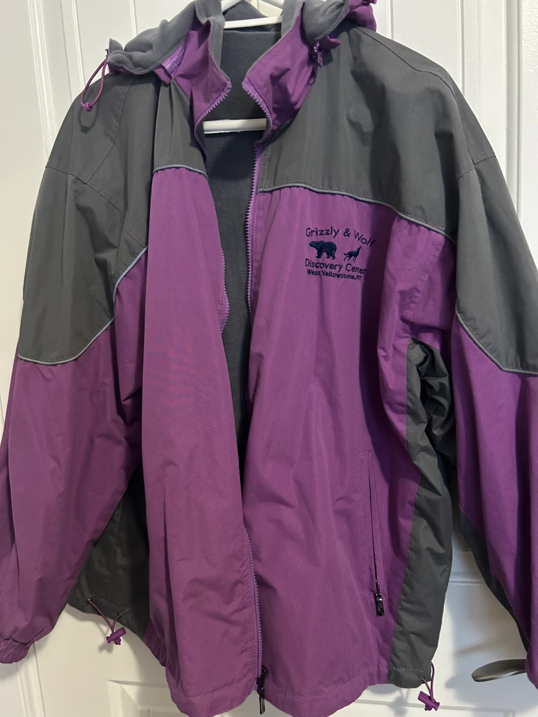 73Selling a Grizzly & Wolf Discovery Center jacket. It's a two-tone jacket with grey and purple colours. Great for outdoor activities!