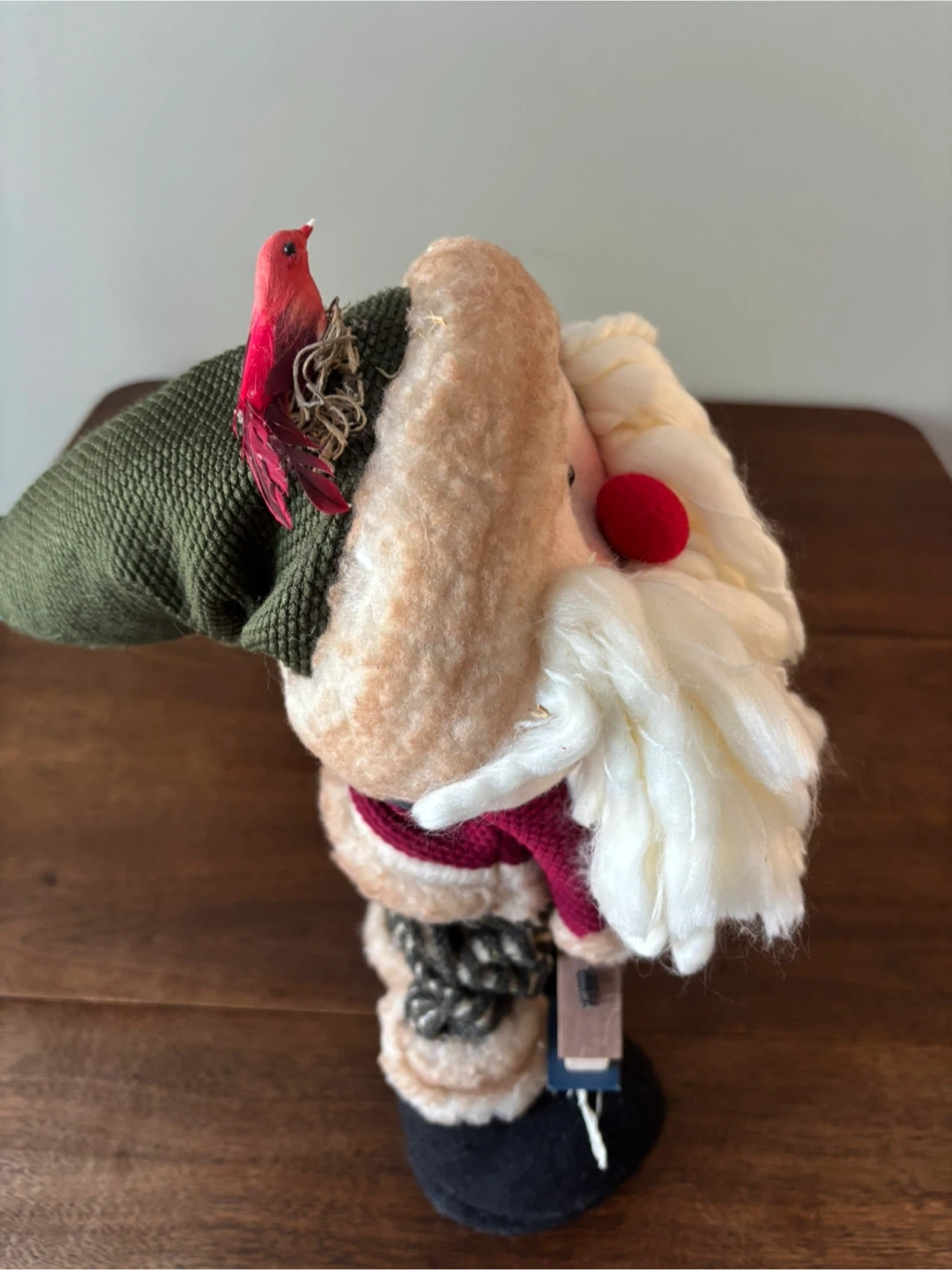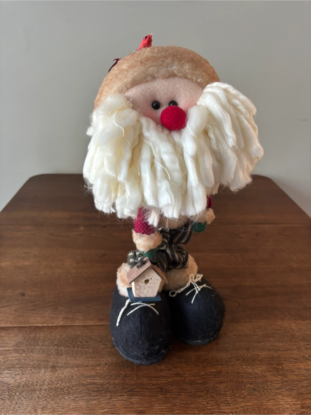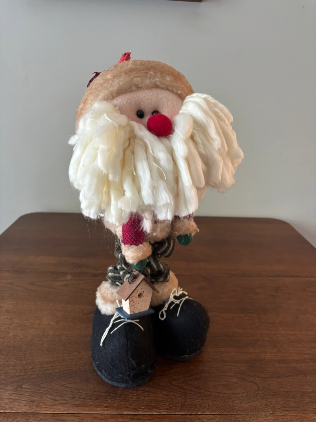 This charming Santa figurine is ready to bring some holiday cheer to your home! It features a unique design with oversized shoes and a birdhouse detail. Perfect for adding a touch of whimsy to your Christmas decor