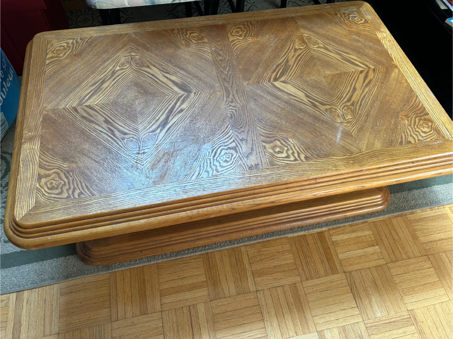 2 pc wooden coffee table set. They have a beautiful wood grain pattern on top and a sturdy base. The tables are in good condition and would be a great addition to any living room! Dimensions 49in L x 30in W and 27in L x 24in W.