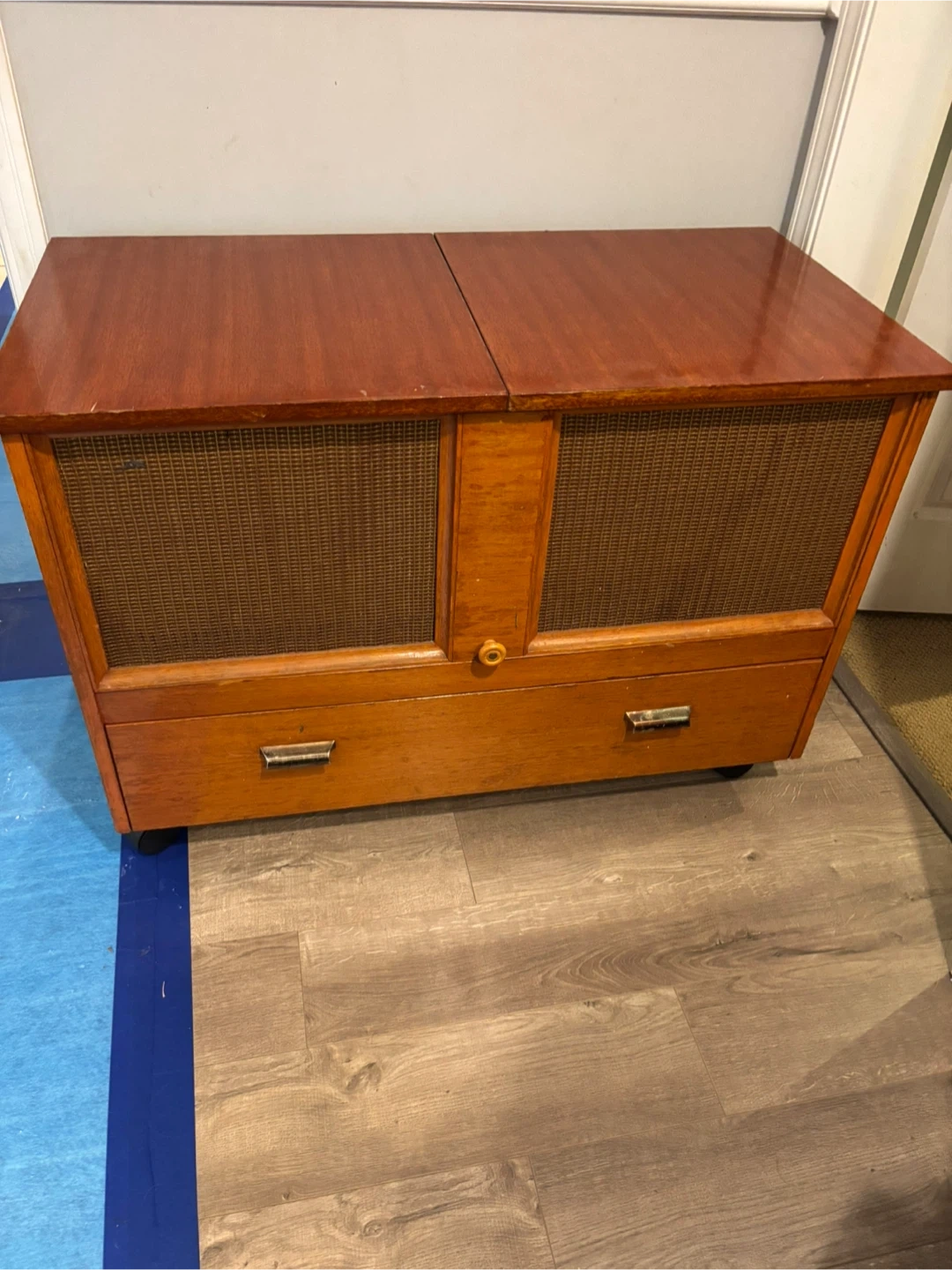 Selling a vintage wooden record player cabinet. It features a beautiful wood finish and ample storage space for your records and accessories. It's a unique piece that would add a touch of retro charm to any room. It is 40 1/2” wide, 28” high, 20 1/2” deep and is on wheels.
