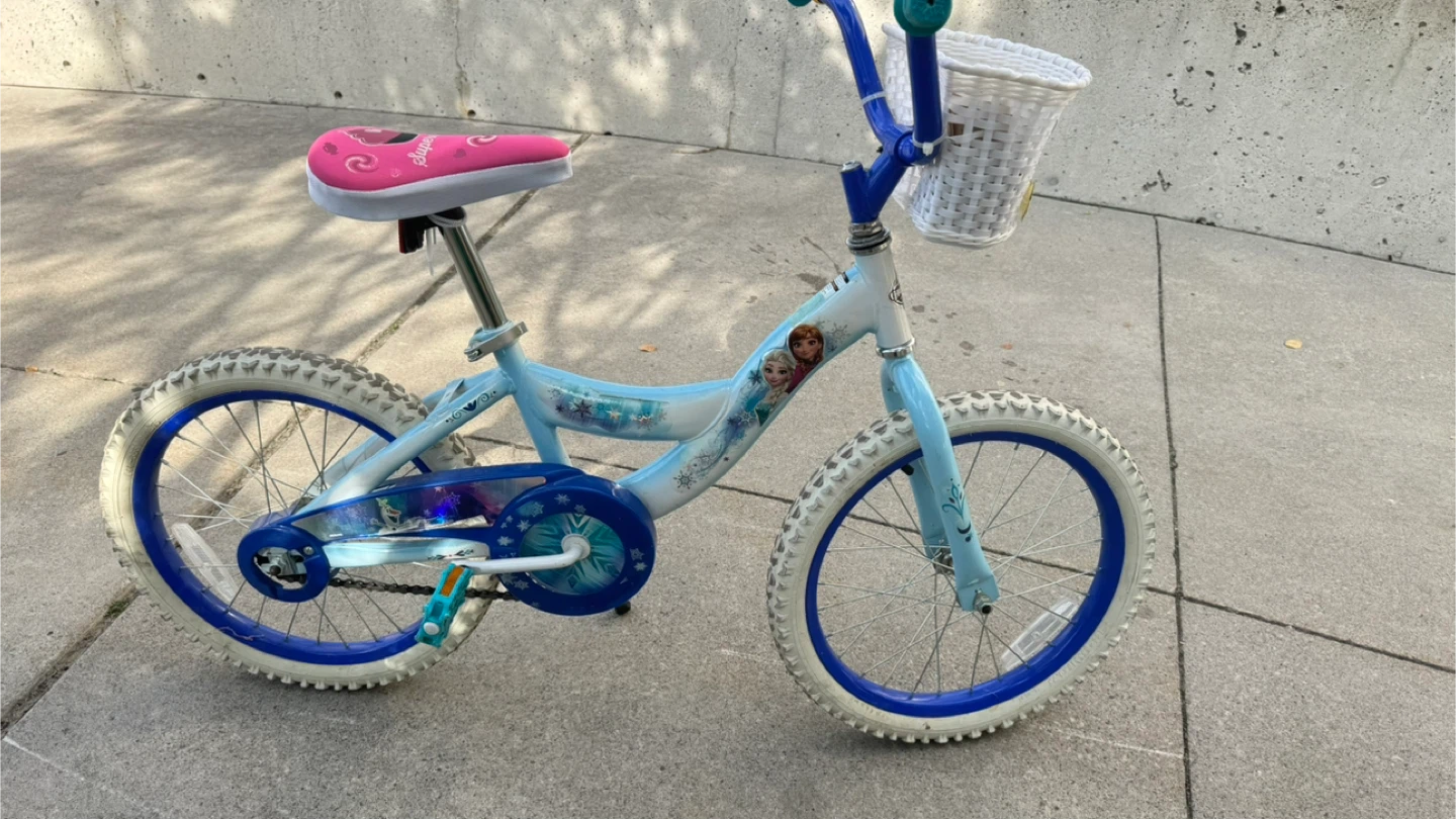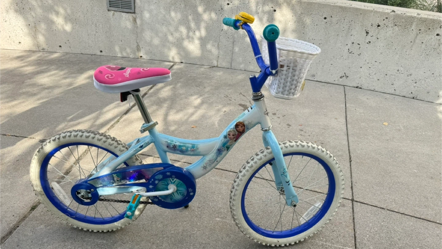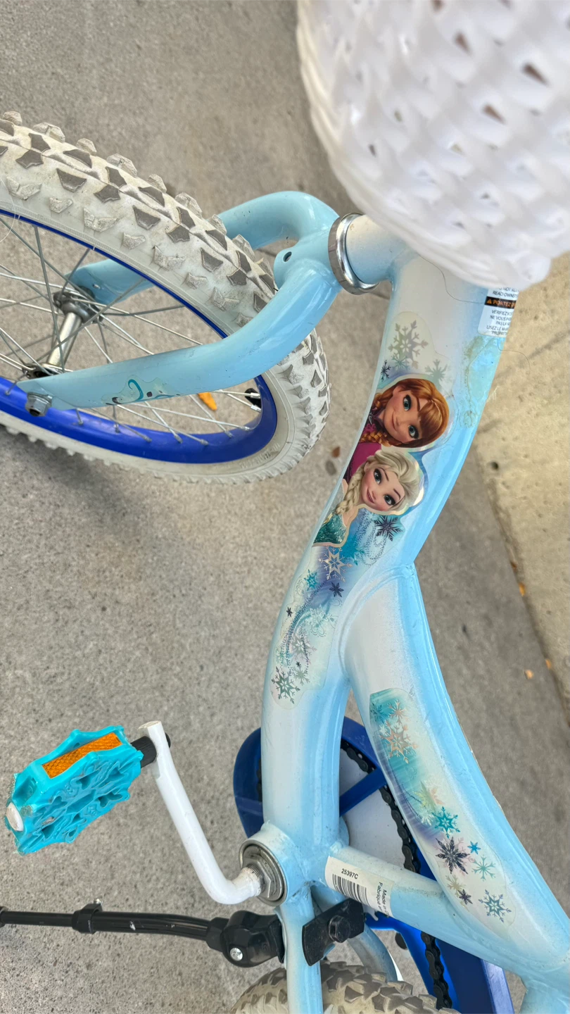 Selling a cute Disney Frozen themed kids bike! It's like new and ready for a new little rider. Perfect for kids who love Elsa and Anna! It has a basket in the front, perfect for carrying toys or snacks on bike rides , only a small cut on the seat , it’s also comes with stabilize pads