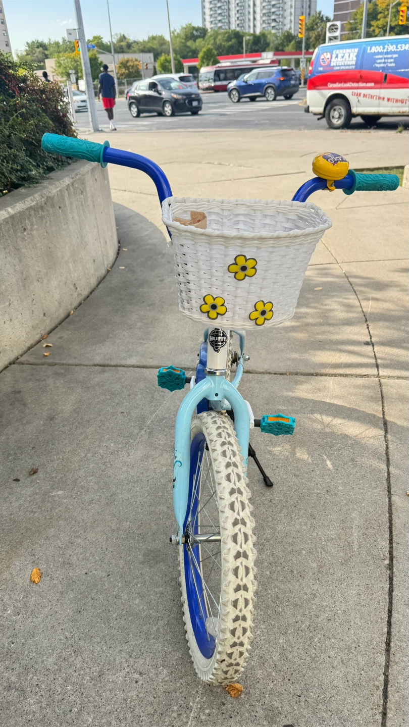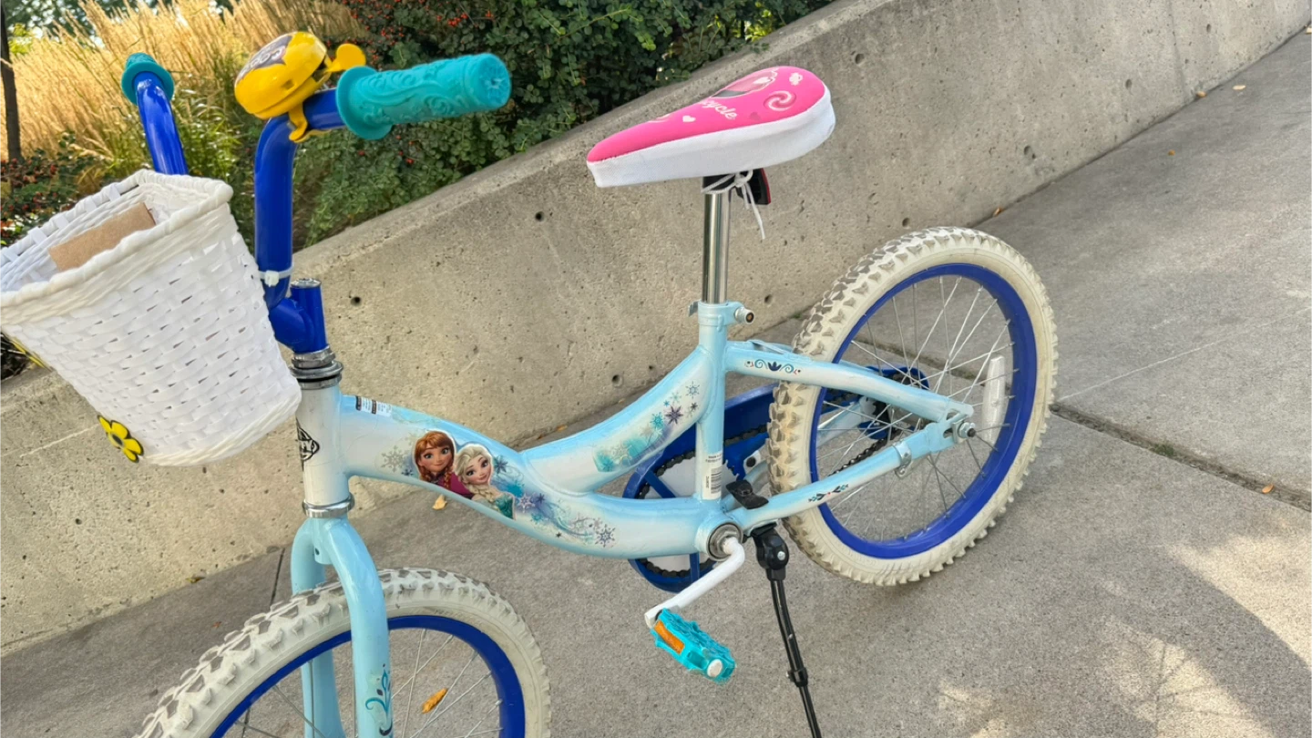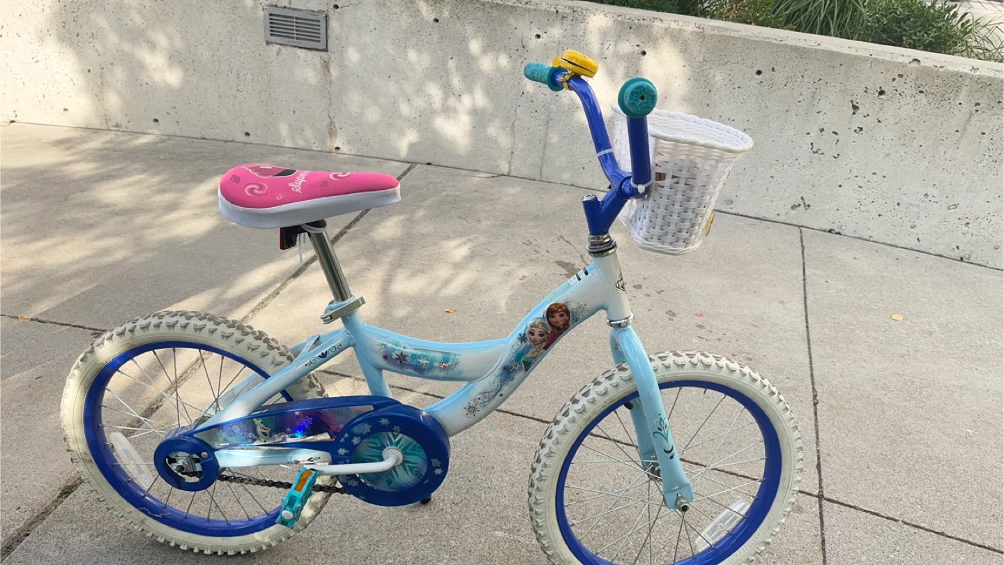 Selling a cute Disney Frozen themed kids bike! It's like new and ready for a new little rider. Perfect for kids who love Elsa and Anna! It has a basket in the front, perfect for carrying toys or snacks on bike rides , only a small cut on the seat , it’s also comes with stabilize pads