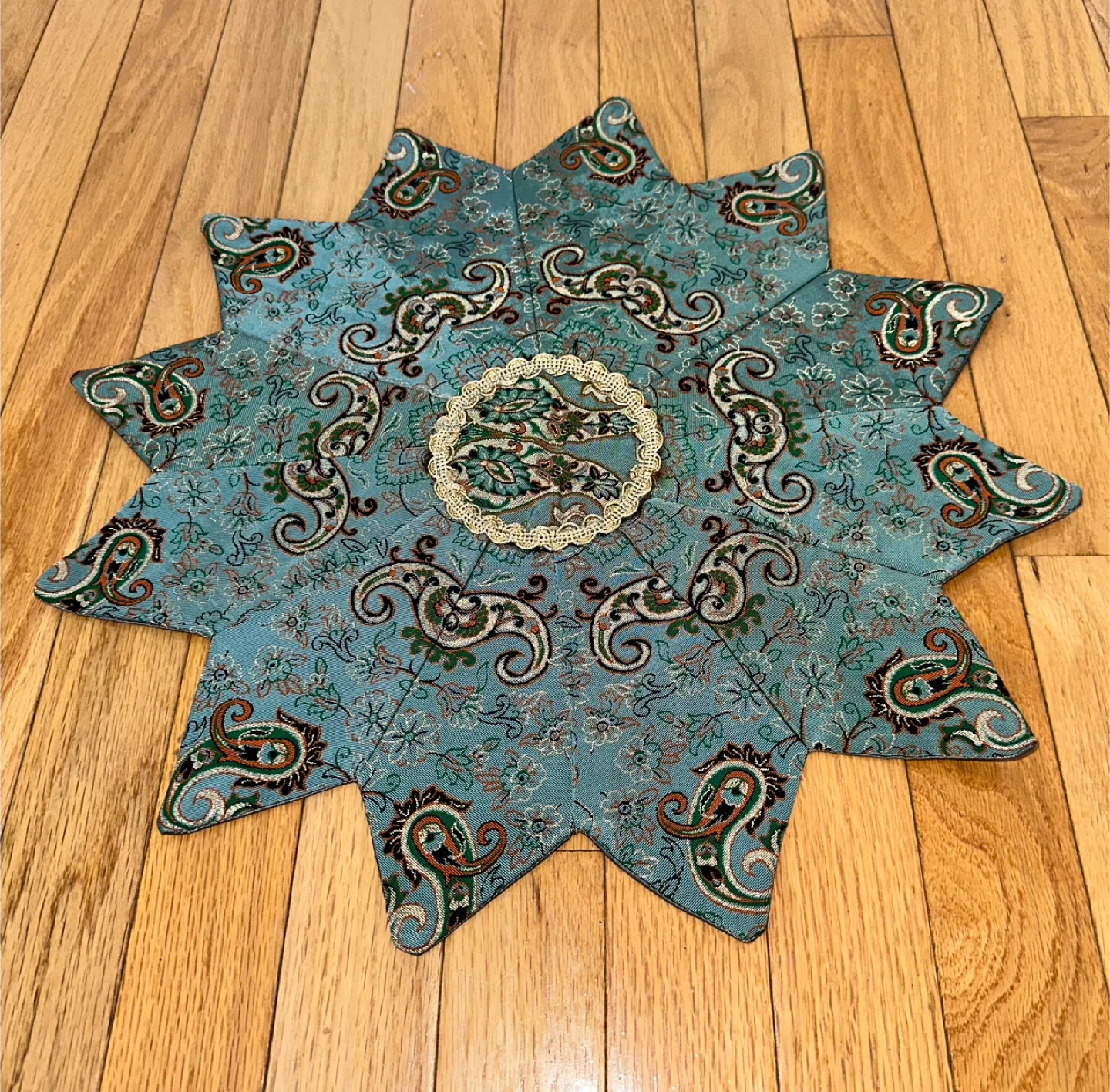 A lovely handmade star-shaped table topper with a beautiful blue paisley pattern. Made with high quality fabric with lining on the back and never been used!