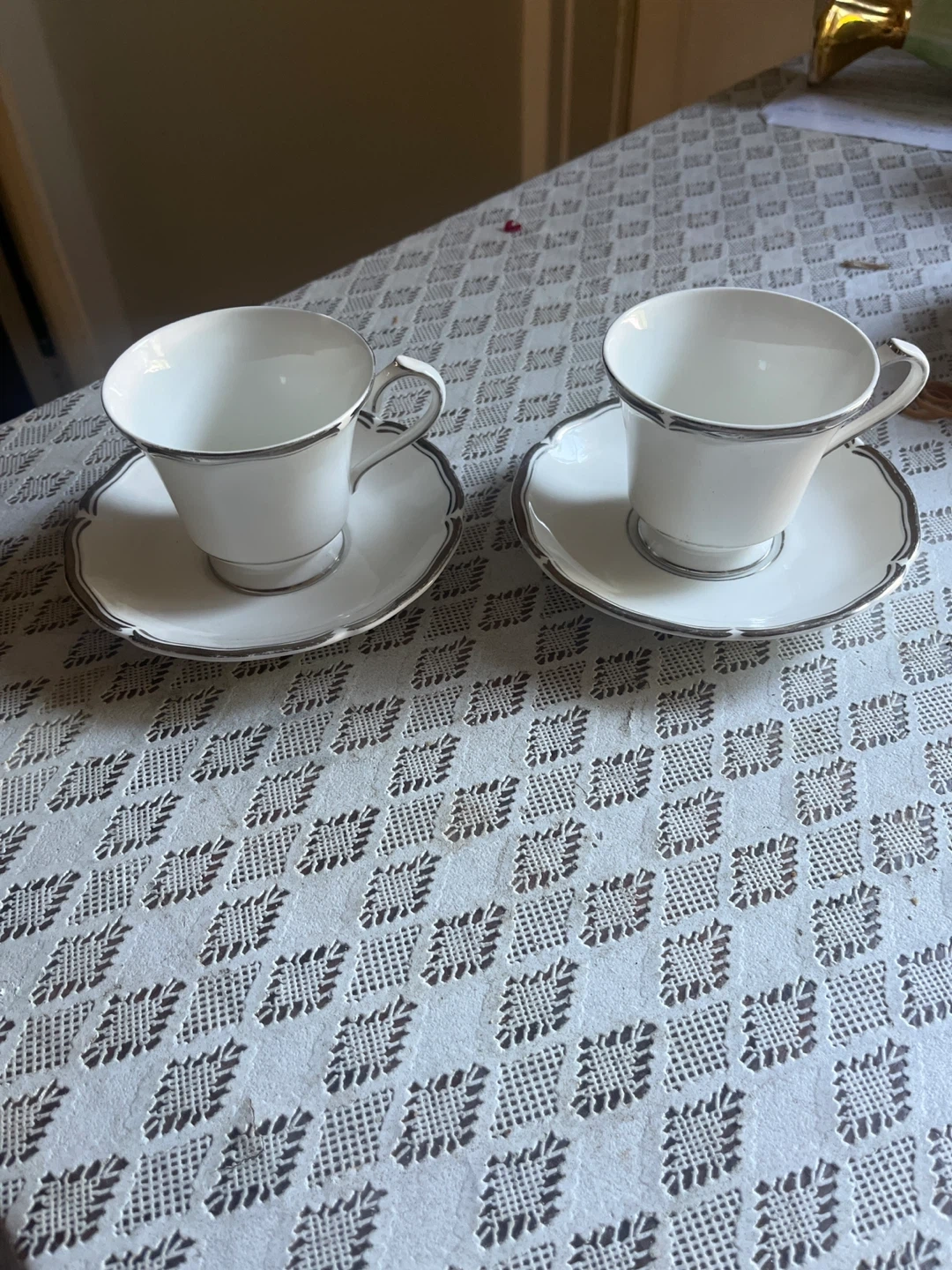Selling a pair of Aynsley Tradition tea cups with saucers. These are made of fine English bone china and feature a delicate silver trim. They are in fair condition and would be perfect for afternoon tea or adding a touch of elegance to your kitchen!