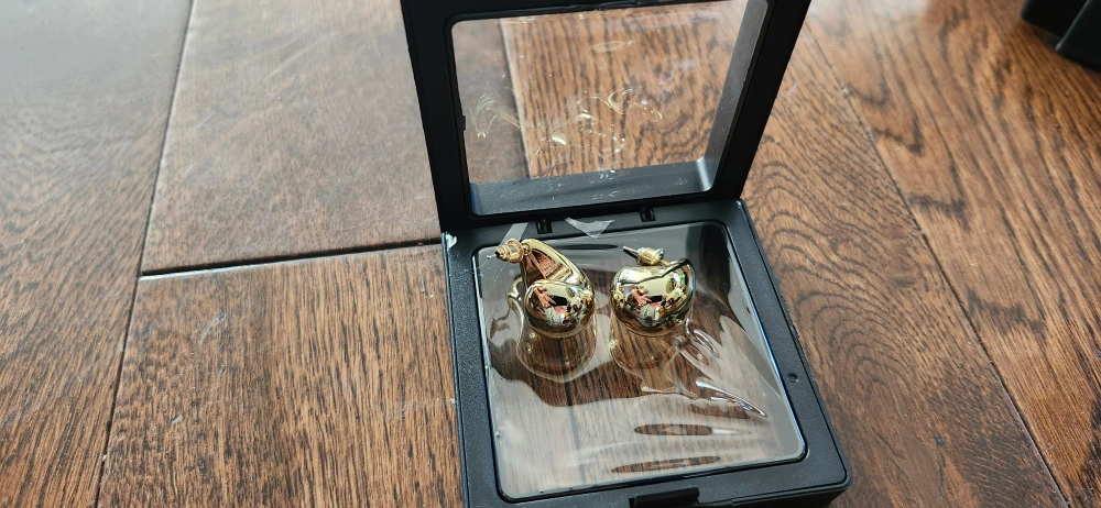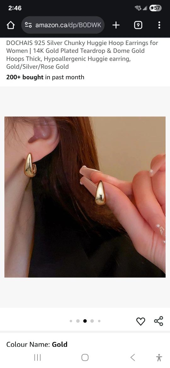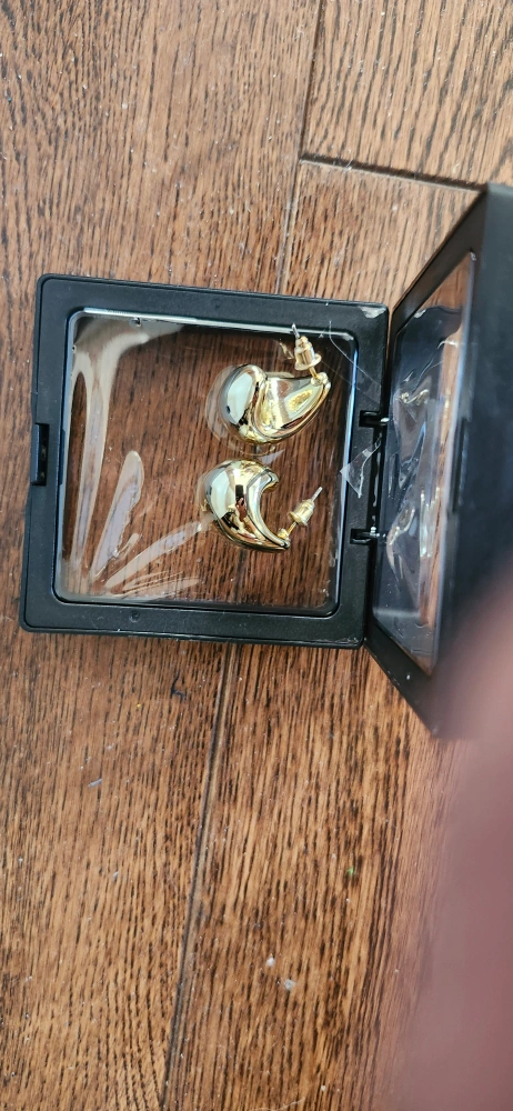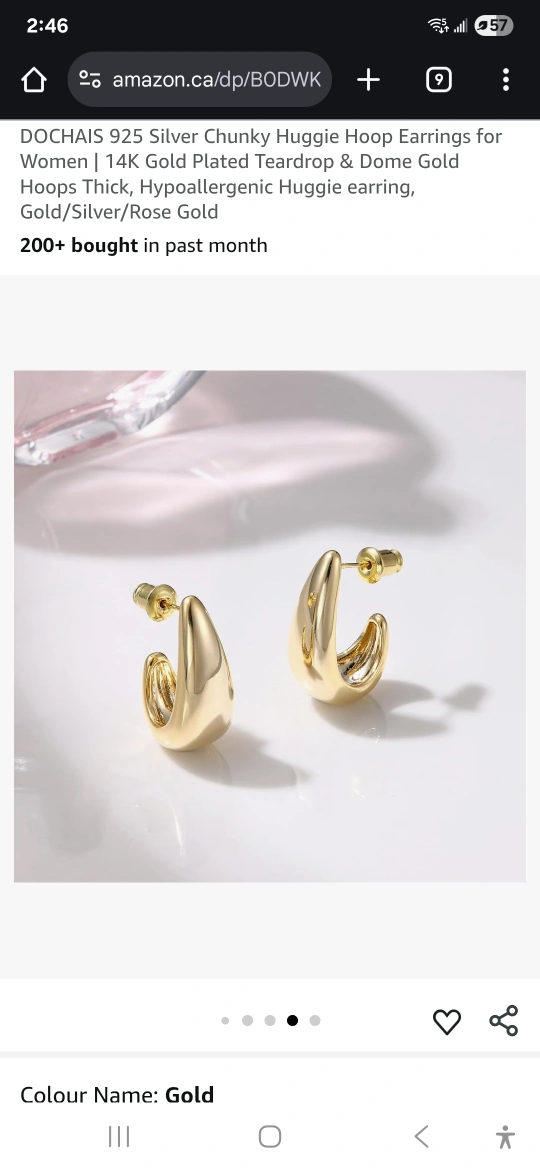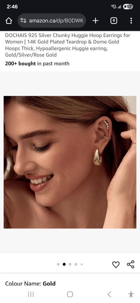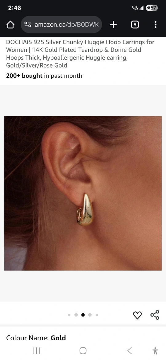 203These are DOCHAIS 925 silver chunky huggie hoop earrings for women. They are 14K gold plated with a teardrop and dome gold hoops thick design. Hypoallergenic huggie earrings in gold. They come in a box!