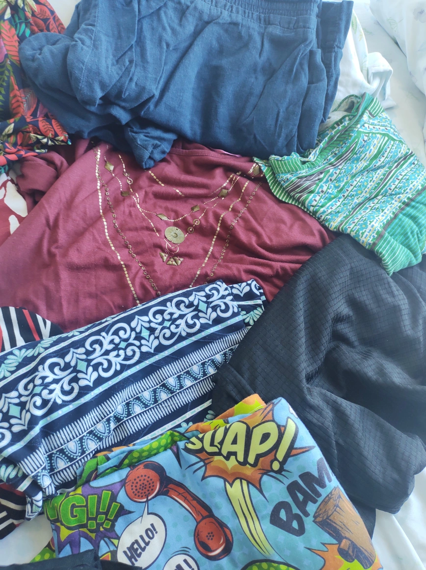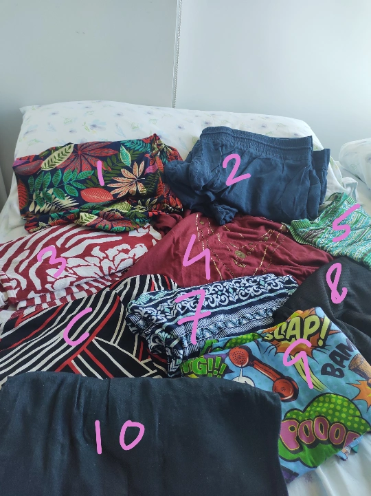 Mixed bag of blouses, tops, tee shirts, spaghettis, bottoms, jeans, swim costumes, underwears, dresses, belt, purses and bags, sweaters, accessories, leggings, makeup, bras, etc.
