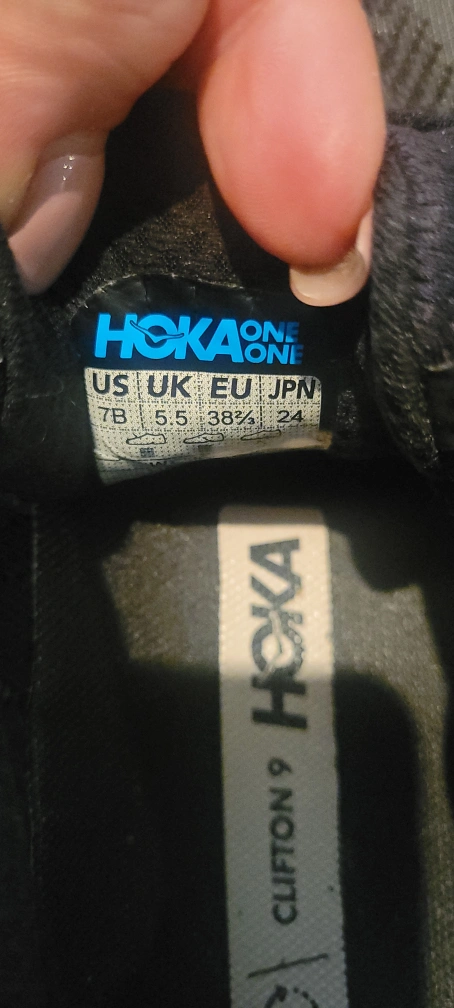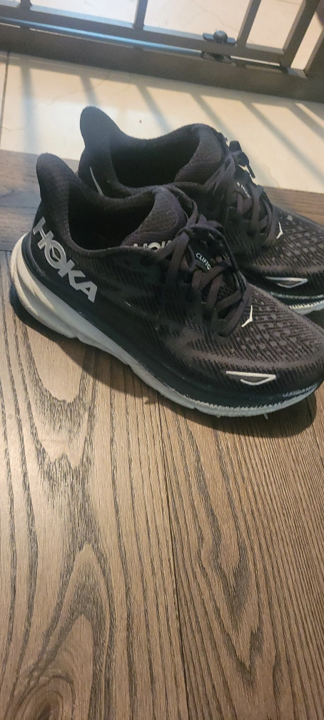 Selling a pair of Hoka Clifton 9 running shoes. They are a US size 7. There are some signs of wear on the front of the shoes as shown in the pictures, but they are still in good condition for running or walking!