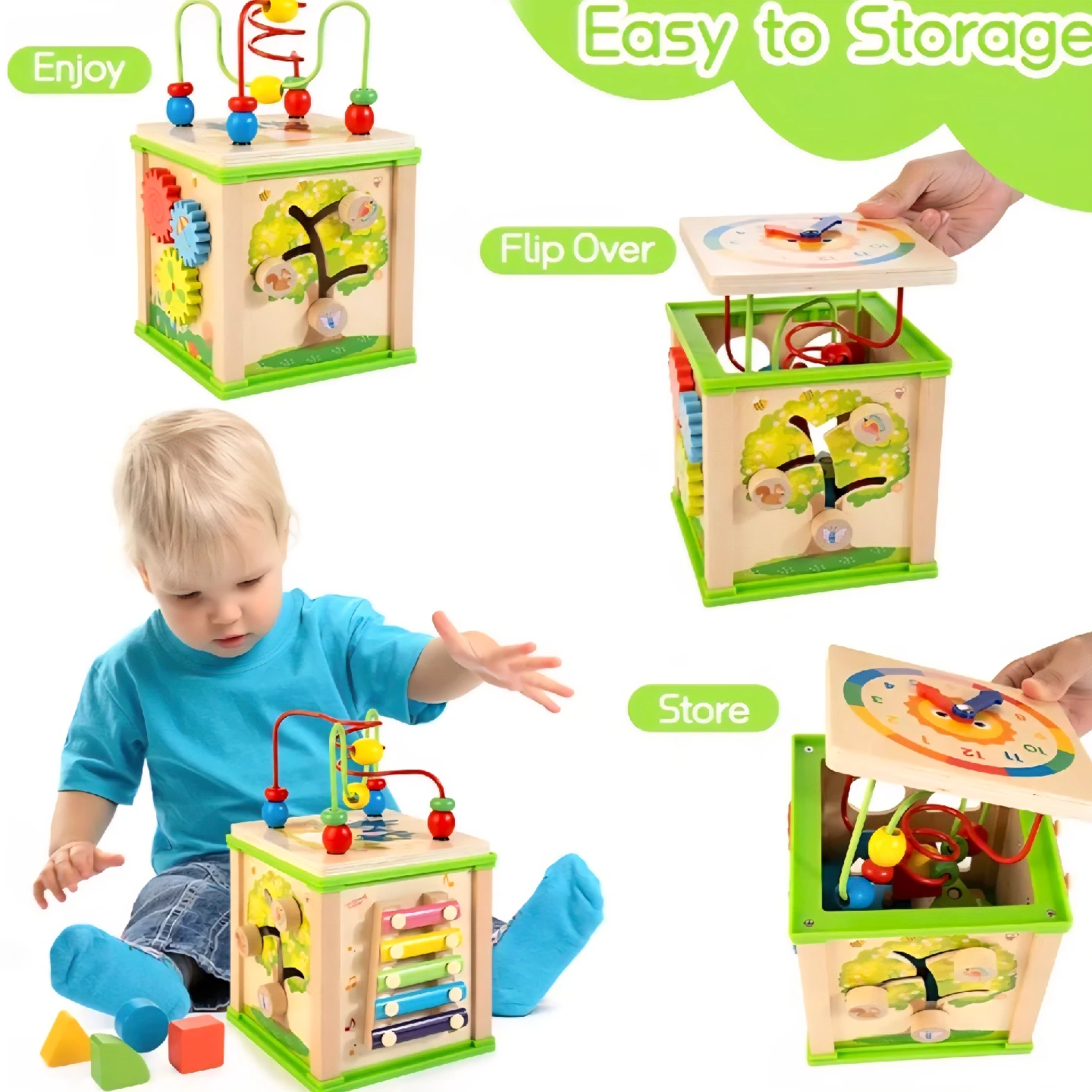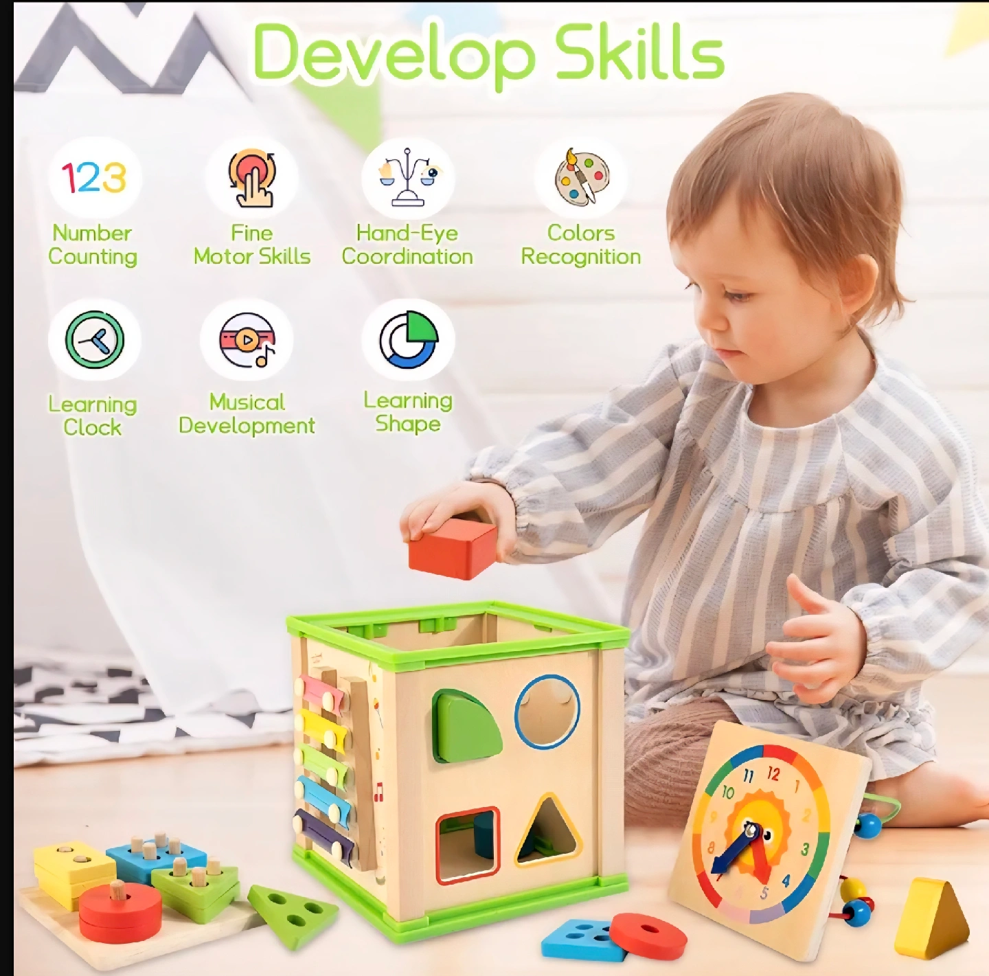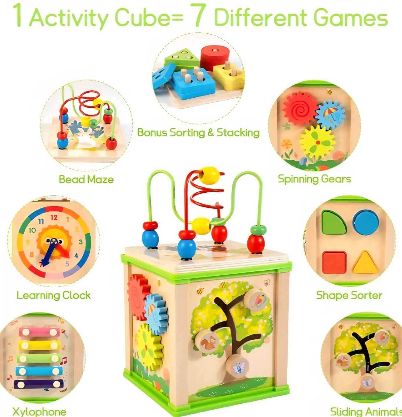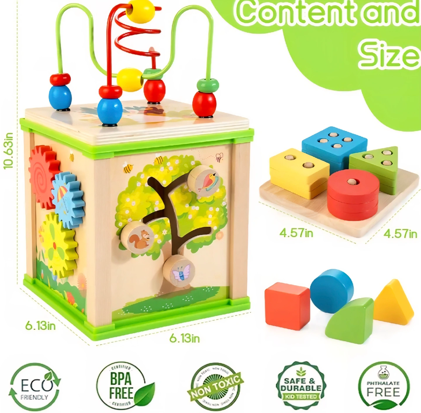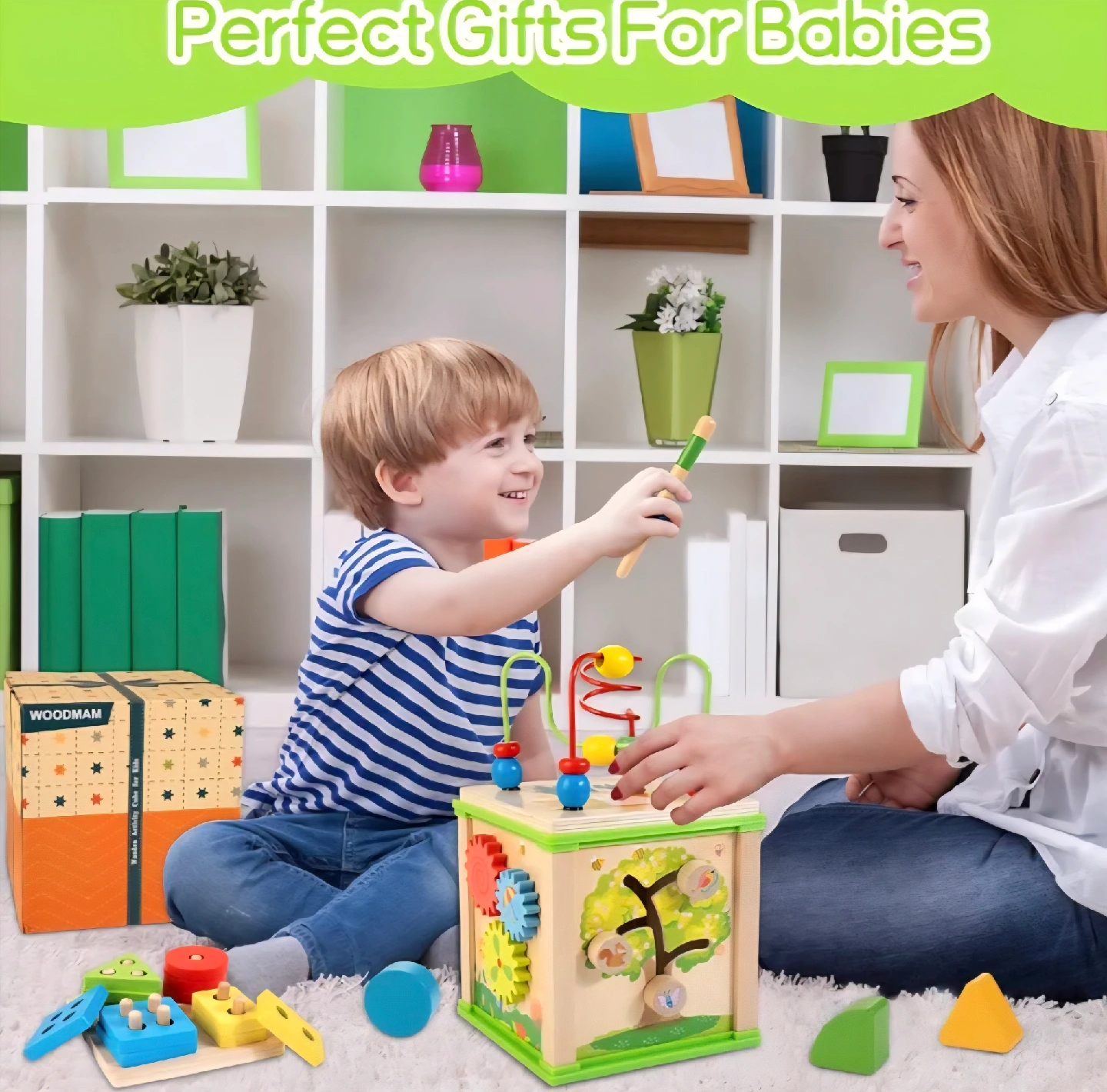 This wooden activity cube is perfect for keeping your little one entertained and learning! It features a variety of activities, including a bead maze, shape sorter, xylophone, and more. Great for developing fine motor skills and problem-solving abilities for 12 months + by WOODMAN