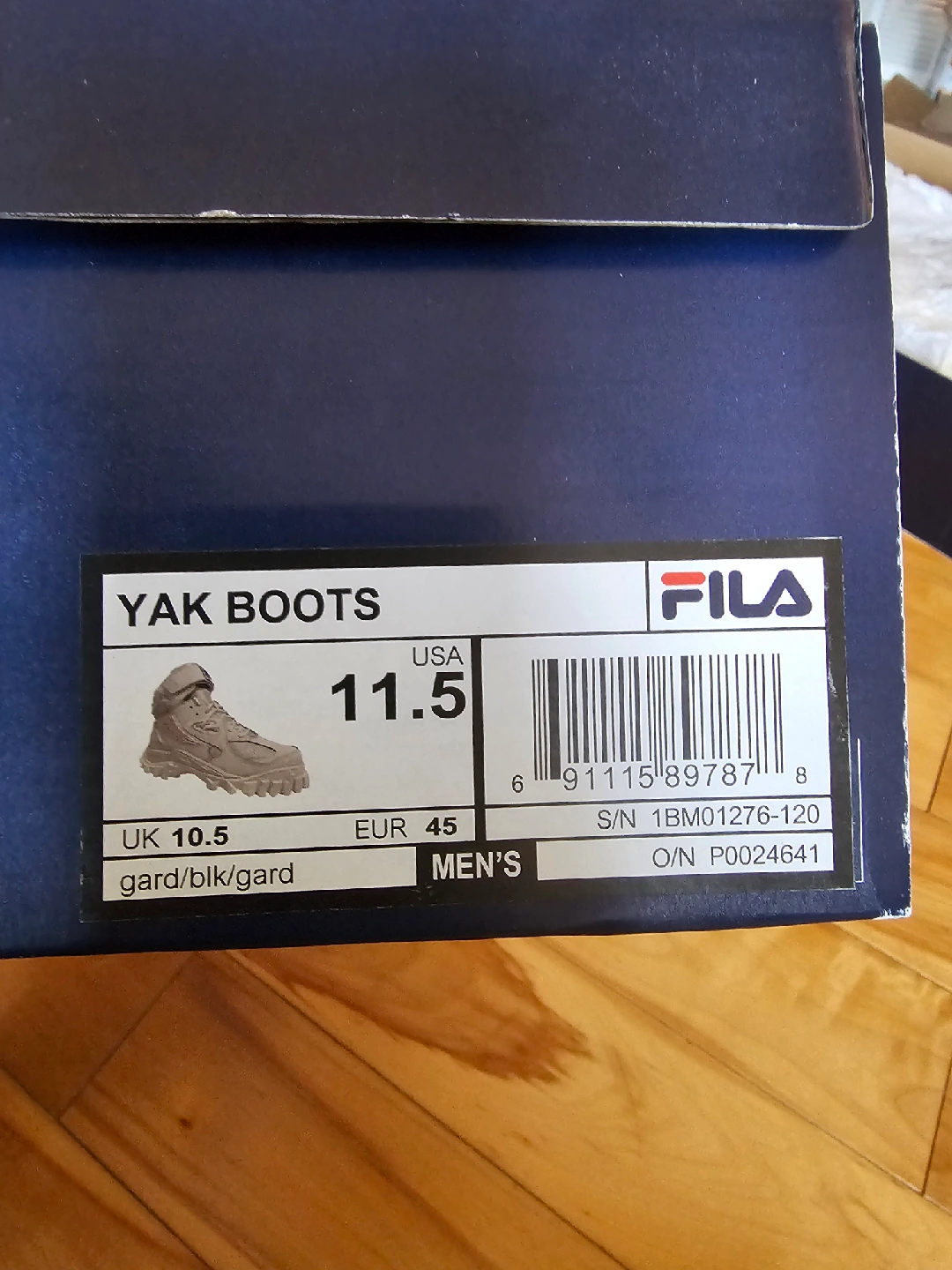 These Fila Yak Trainer sneakers are in great condition and come with the original box! They are a stylish high-top design in a clean white colour. Perfect for adding a unique touch to your wardrobe. There are two pairs of shoes each pair is for sell at the Cost of $110 CAD.