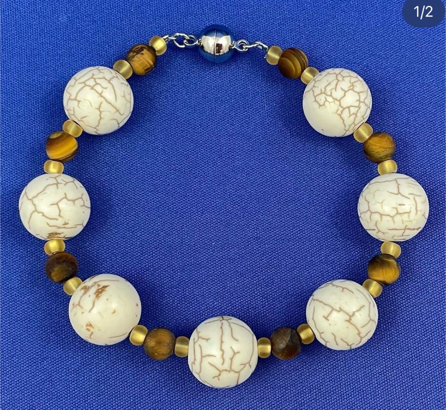 Handmade beaded bracelet featuring white howlite and tiger’s eye on nylon wire, secured with a sterling silver magnetic clasp for easy wear.