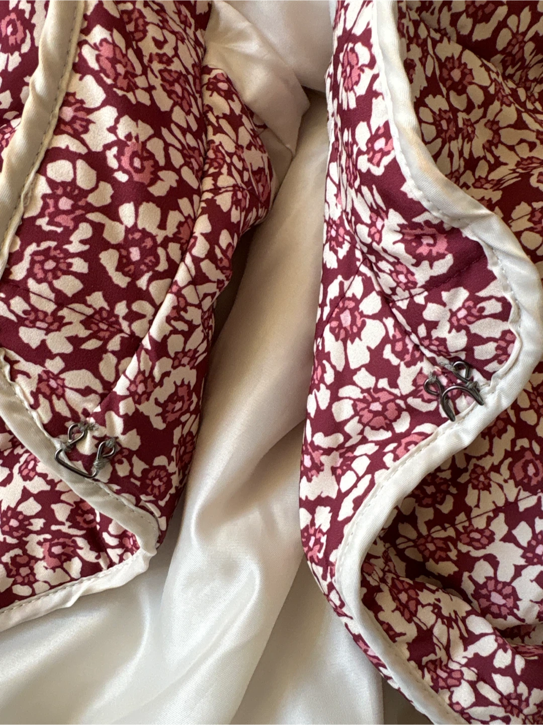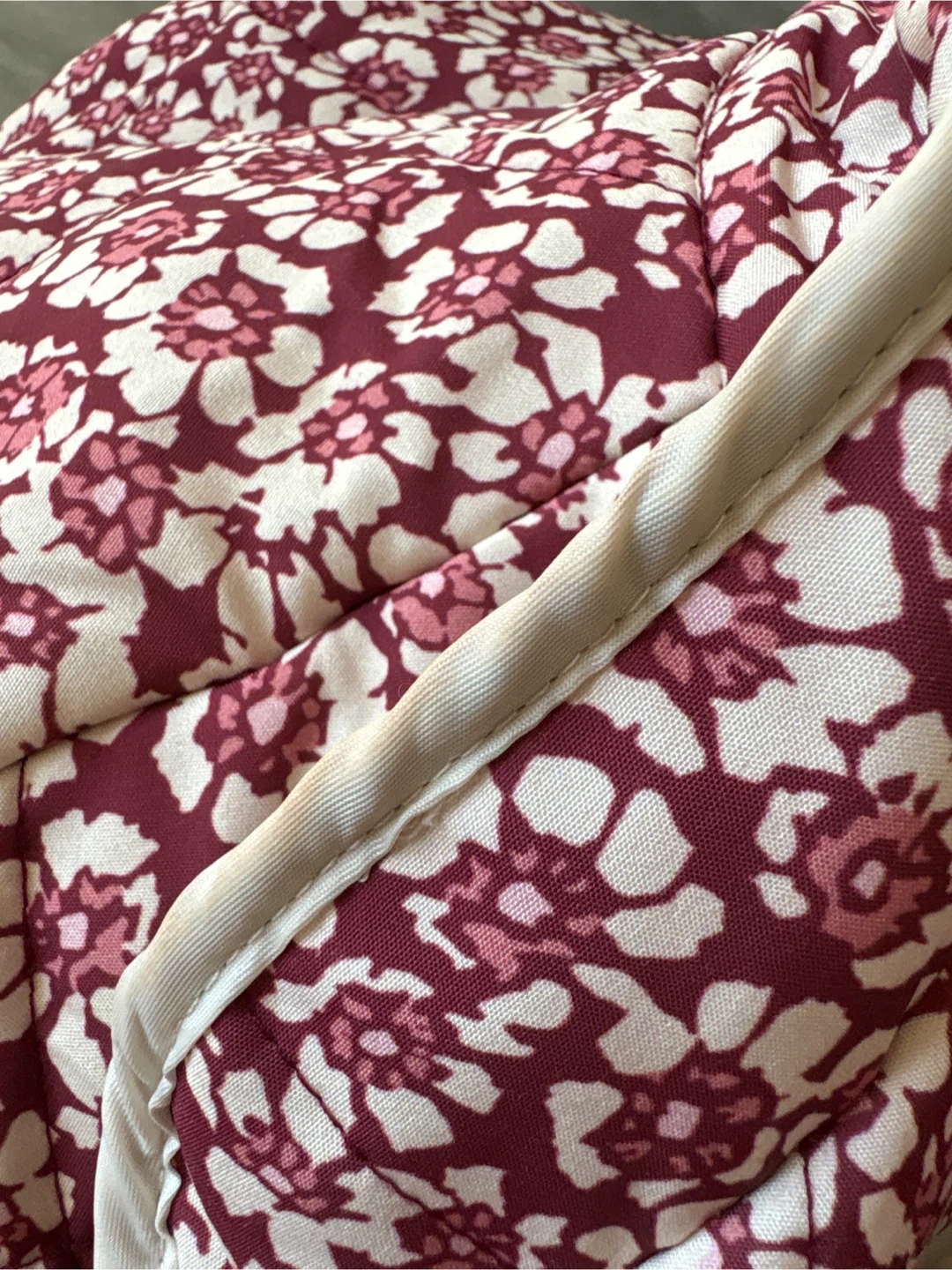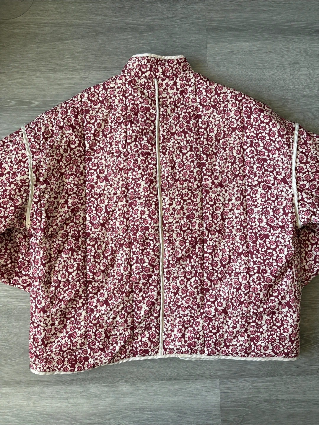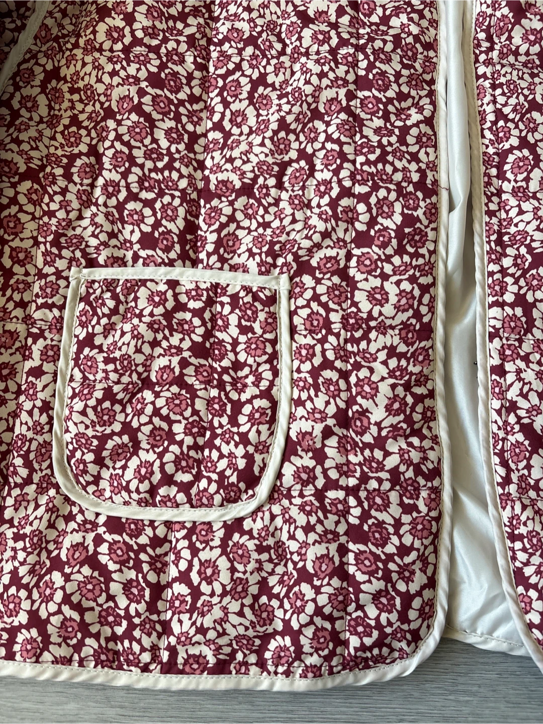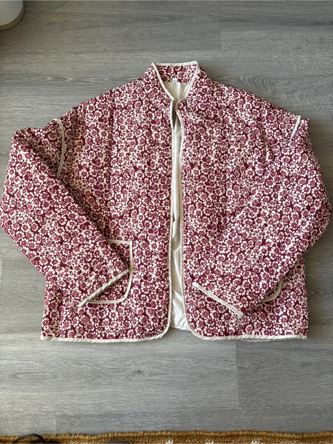 Selling a super cute floral quilted jacket! It has a lovely pattern and is in great condition. Perfect for adding a touch of style to your wardrobe. Small tear in the inside seam, not noticeable when wearing. Priced accordingly.