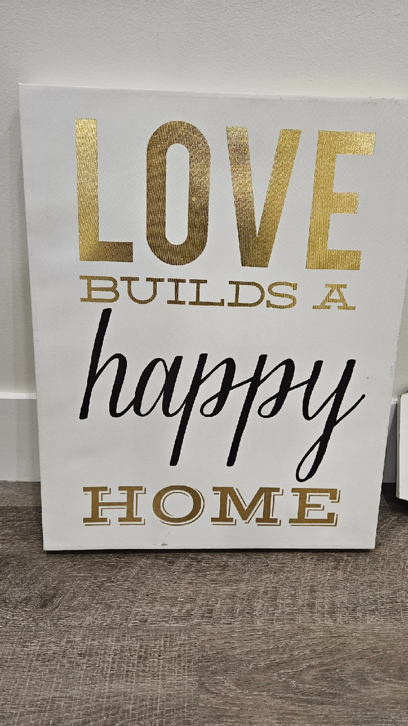 10A cute canvas wall art piece with the saying "Love Builds a Happy Home" printed on it in gold and black lettering! Perfect for adding a touch of warmth to any room