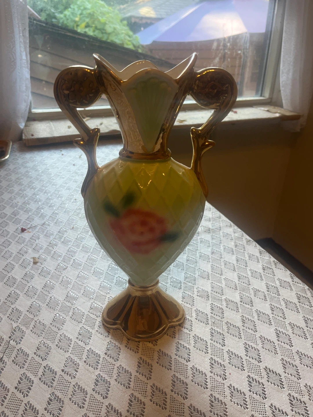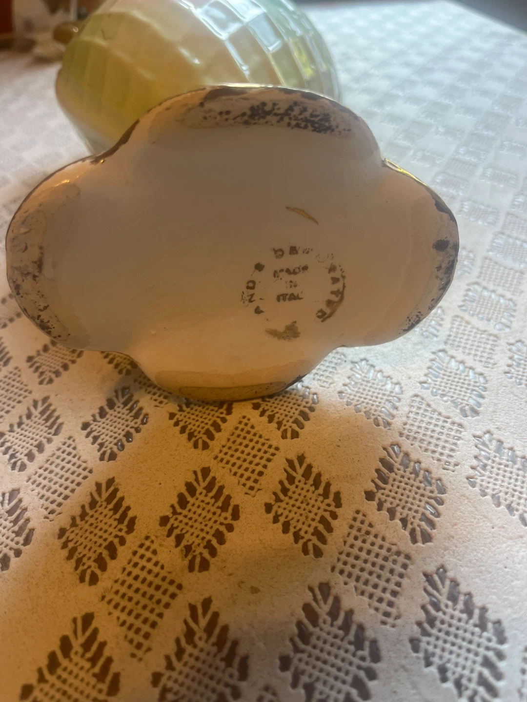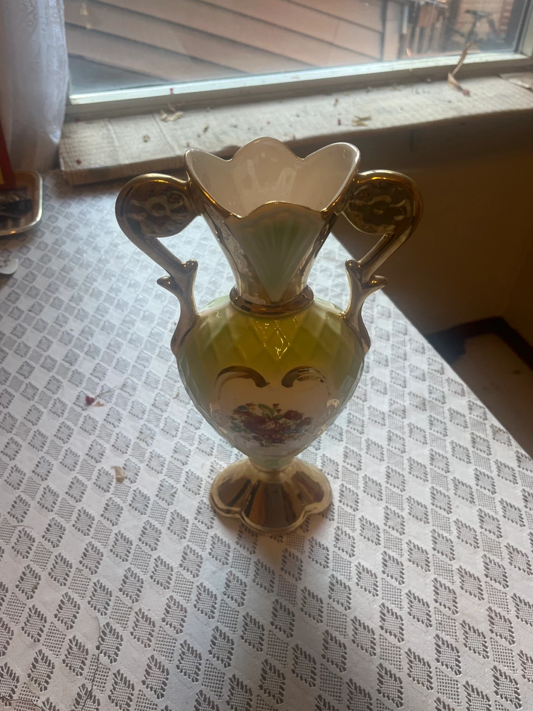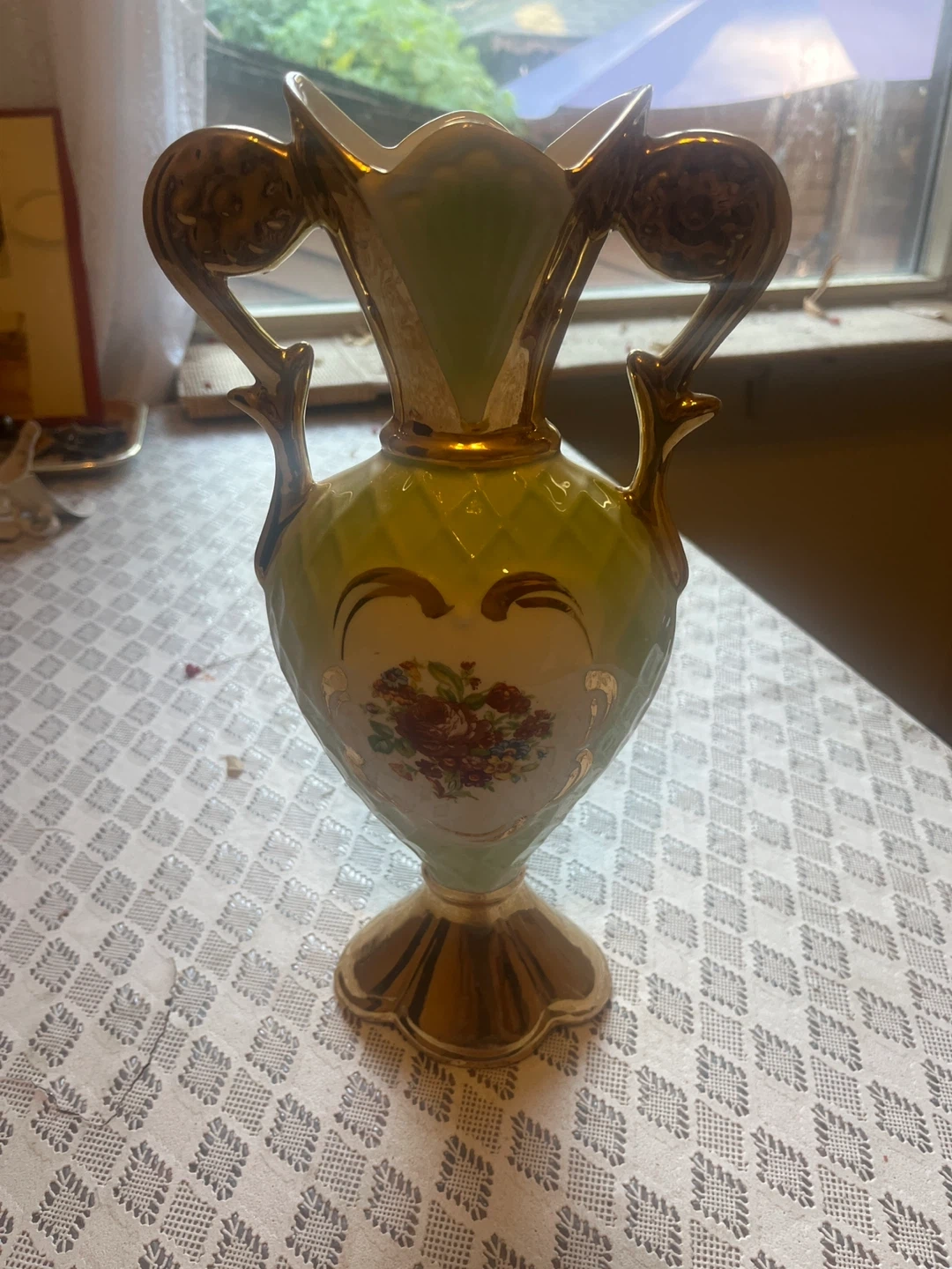 10Selling a beautiful vintage vase, marked 'Made in Italy' on the bottom. It features a lovely light green and gold colour scheme with floral accents. Perfect for adding a touch of elegance to any room