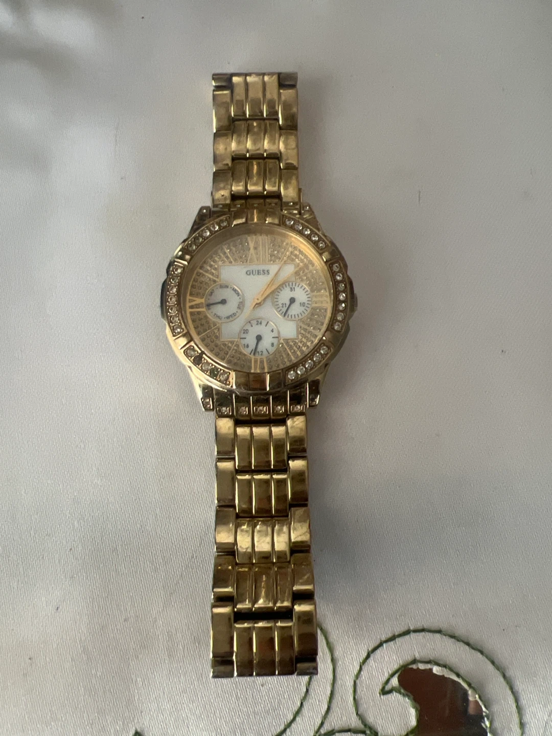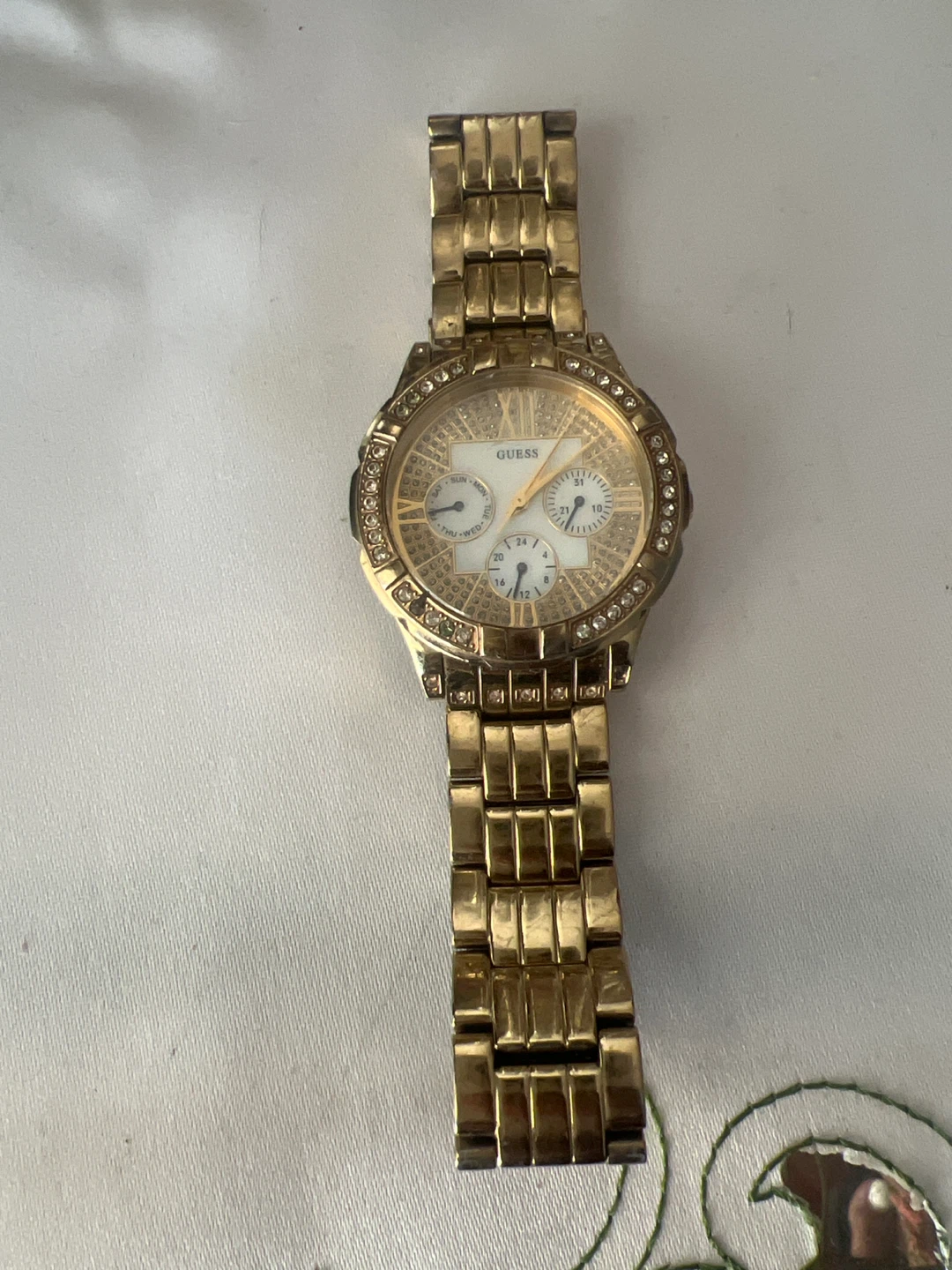 Selling a Guess women's watch in gold. It's in great condition and has a beautiful design. The watch features a gold band and a detailed face. Perfect for adding a touch of elegance to any outfit!