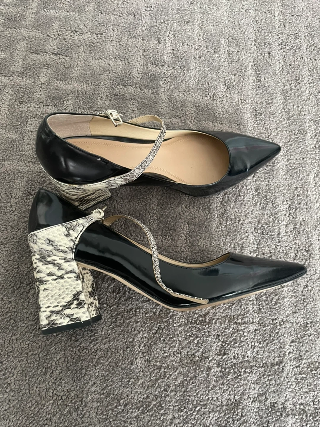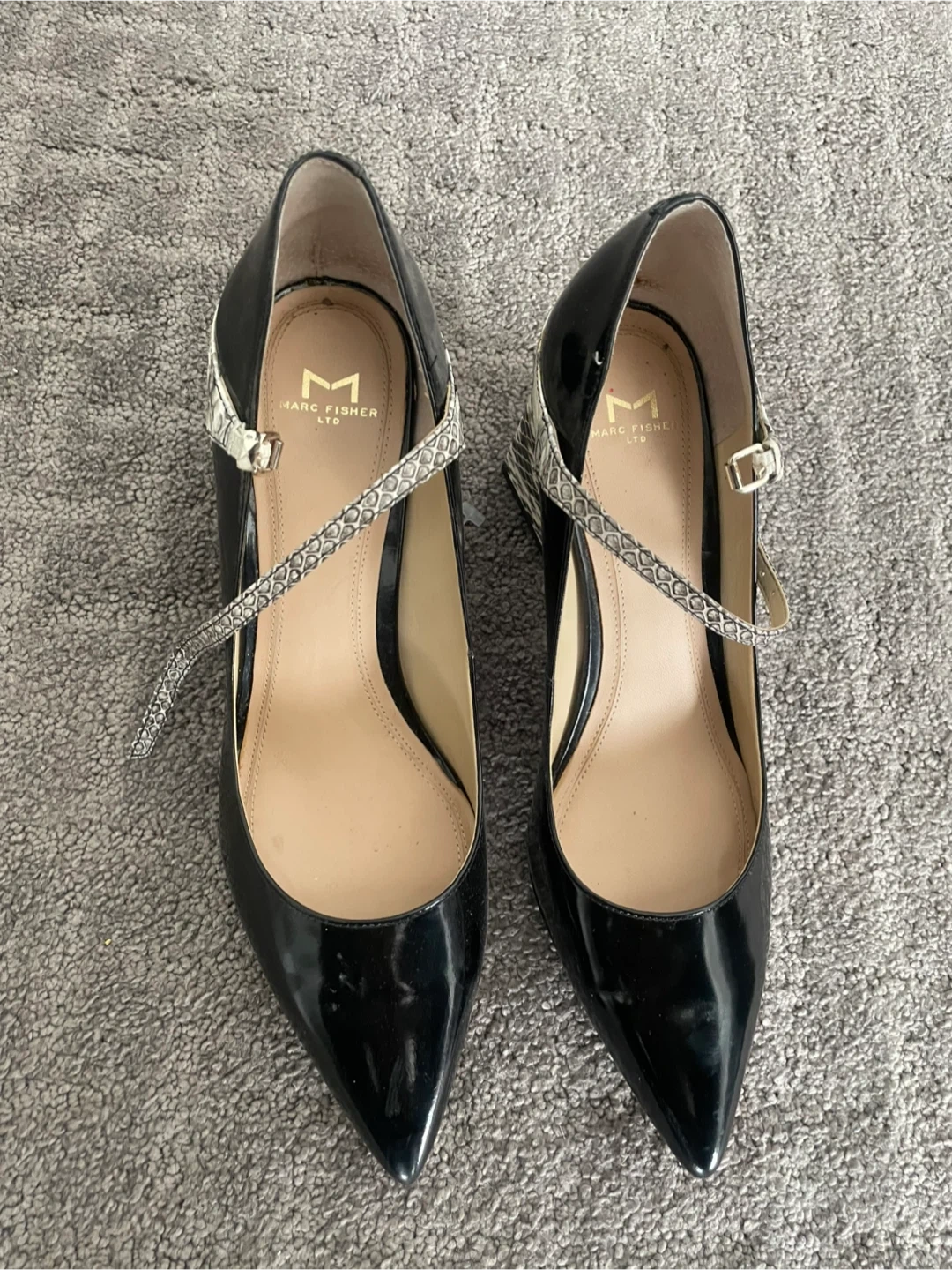 28Selling a pair of Marc Fisher black heels in size 8! They have a stylish snakeskin accent on the heel and strap. Perfect for dressing up any outfit