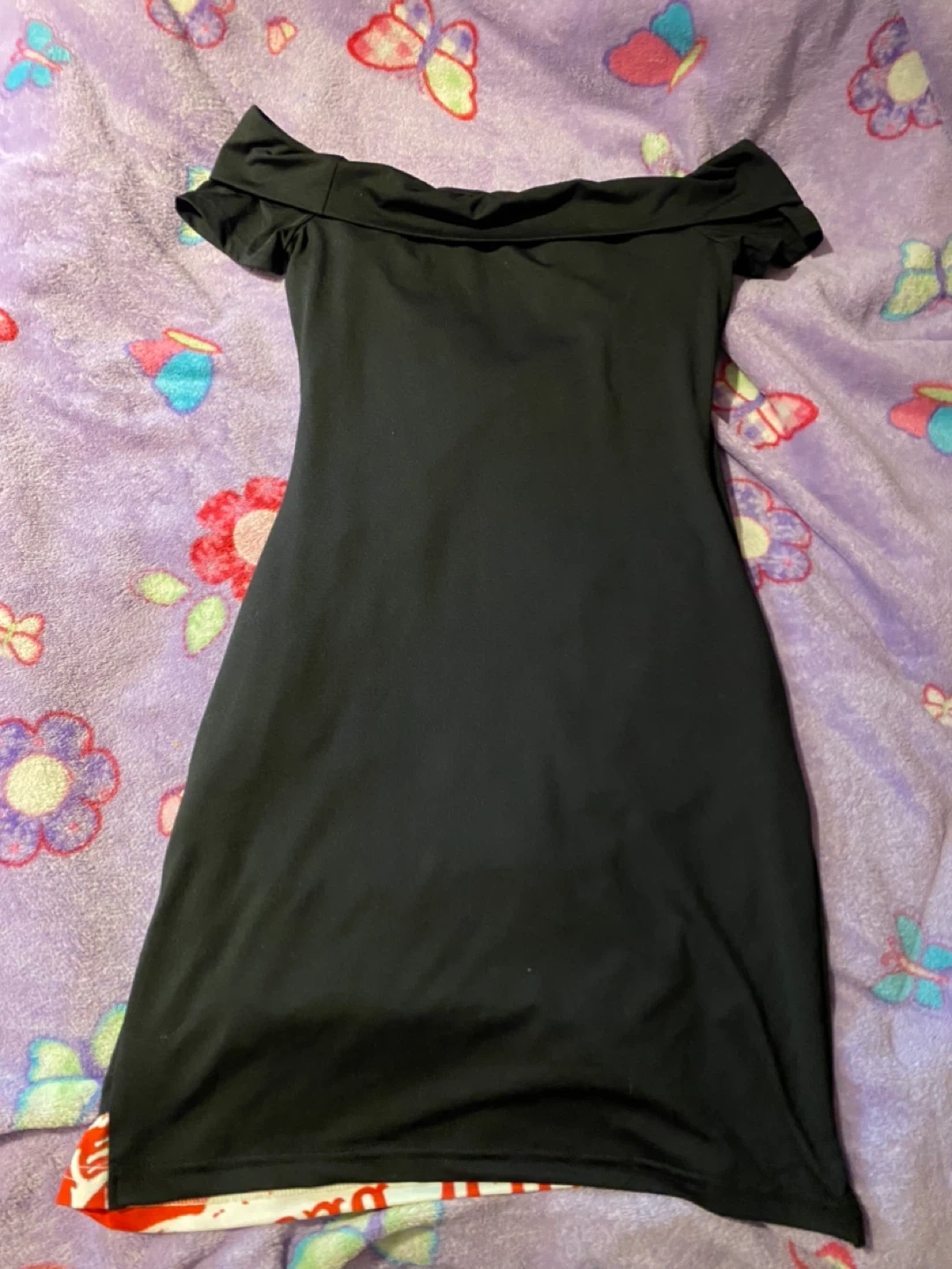 Here's a black off-the-shoulder dress! It's in great condition and perfect for a night out or a special occasion. The fabric is soft and comfortable, making it a pleasure to wear. It features a flattering silhouette that will make you feel confident and stylish