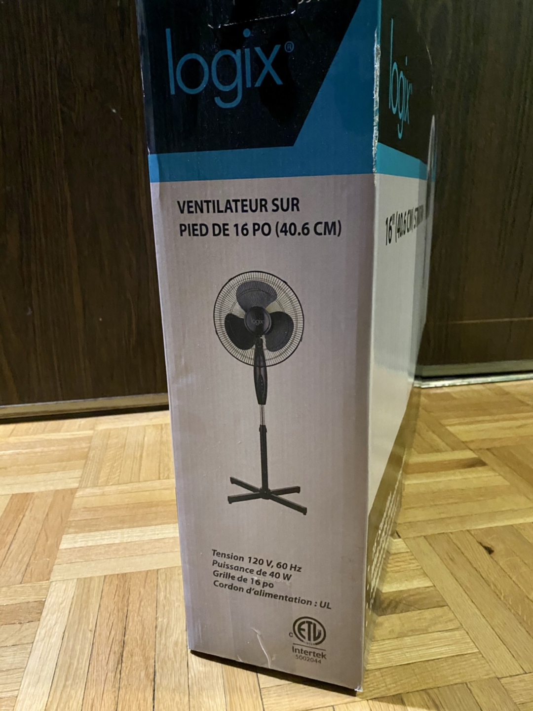 Logix 16" Oscillating Stand Fan, Black * Wide angle motorized oscillation * Adjustable-tilt head * 3 comfort speeds * 16" Grill Works well, used couple of times. Packed in box. Pick up in Etobicoke (Bloor and Islington).
