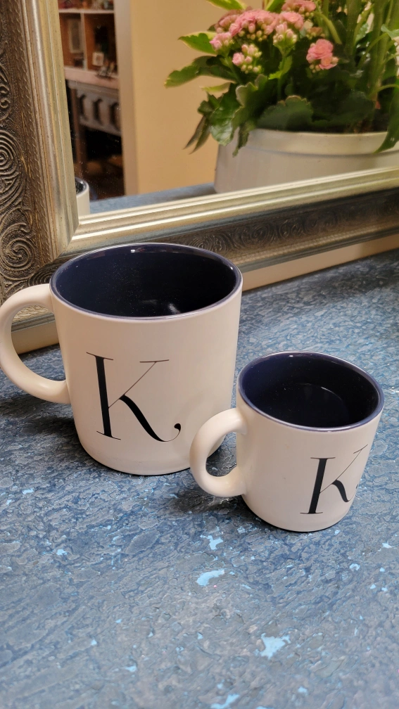 Selling a set of two Brand New Indigo mugs, one larger and one smaller, both featuring the letter 'K'