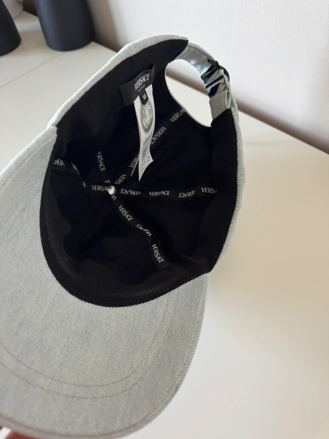 This is a light blue Versace denim cap in size 60. The brand name is embroidered on the front.