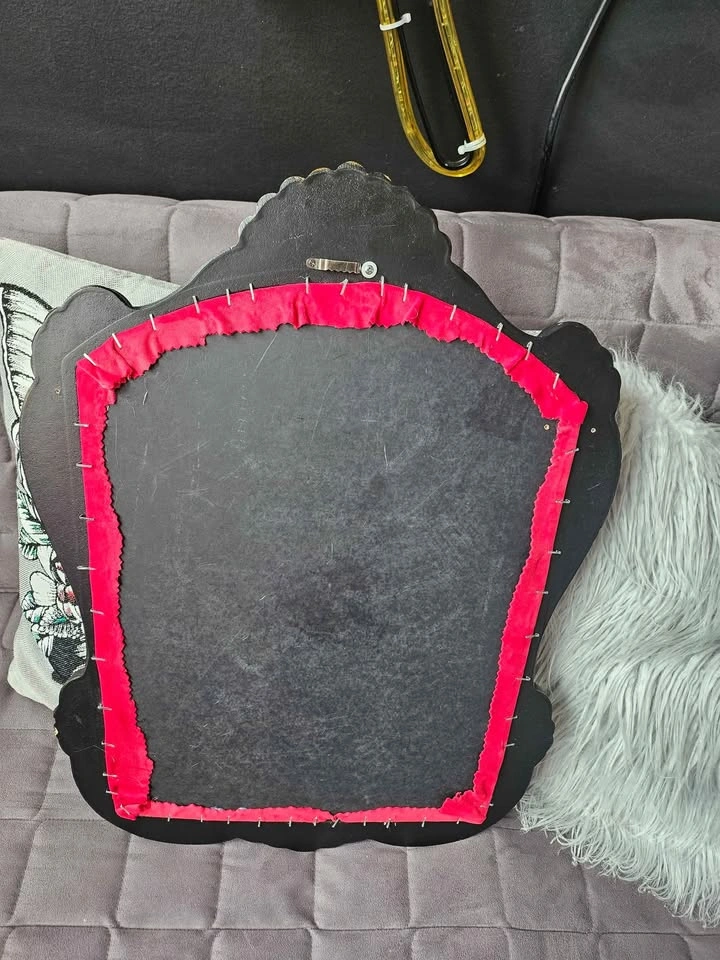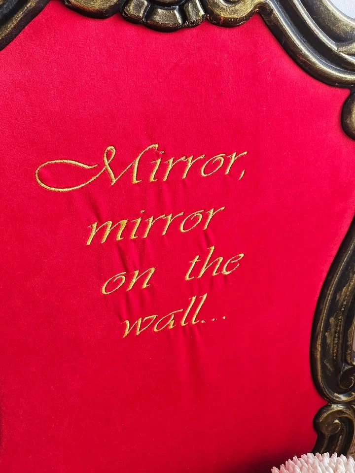 Wood frame with embroidered quote from Snow white on red velvet. Pick up at 471 jevlan drive unit 7 Woodbridge.