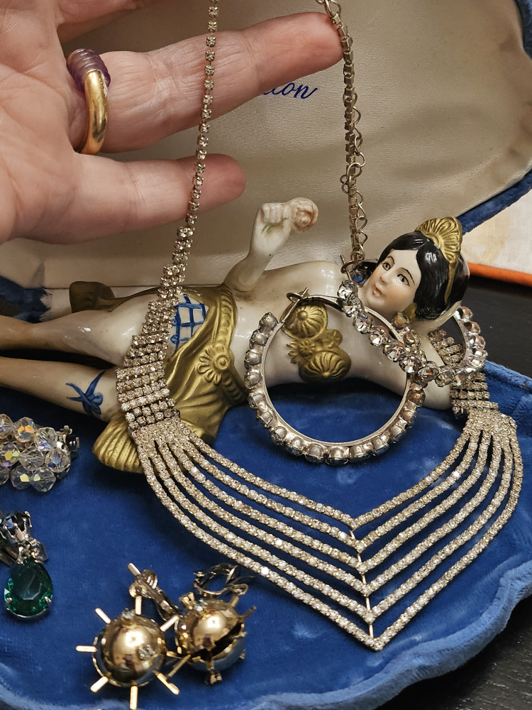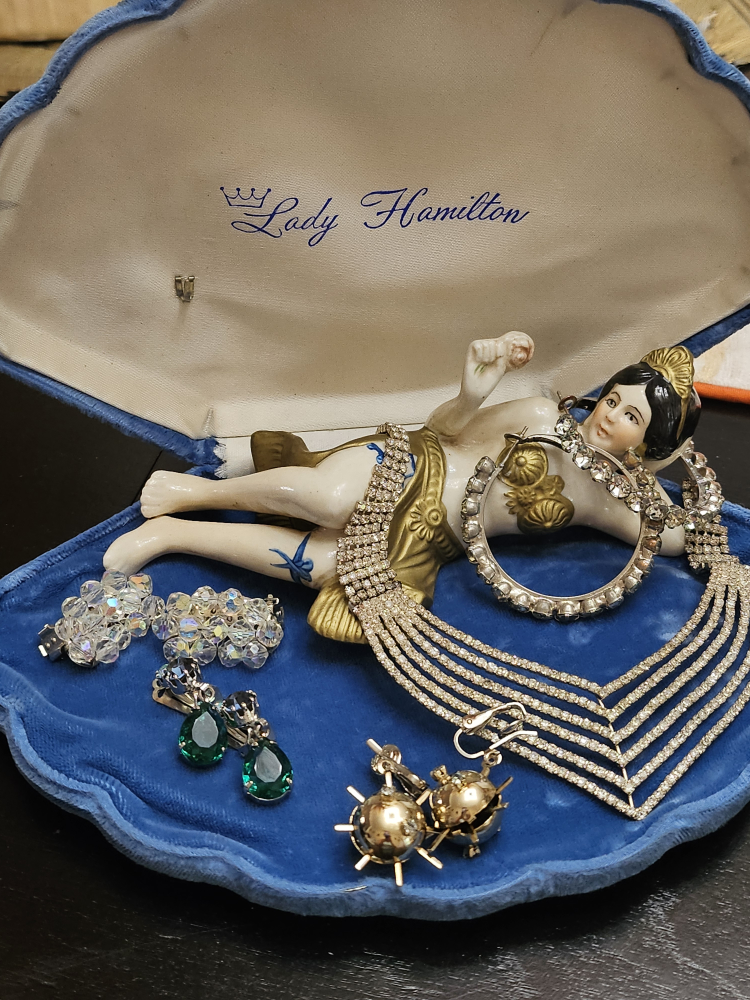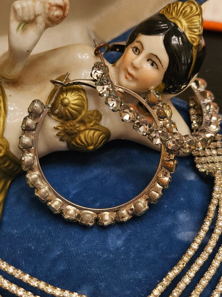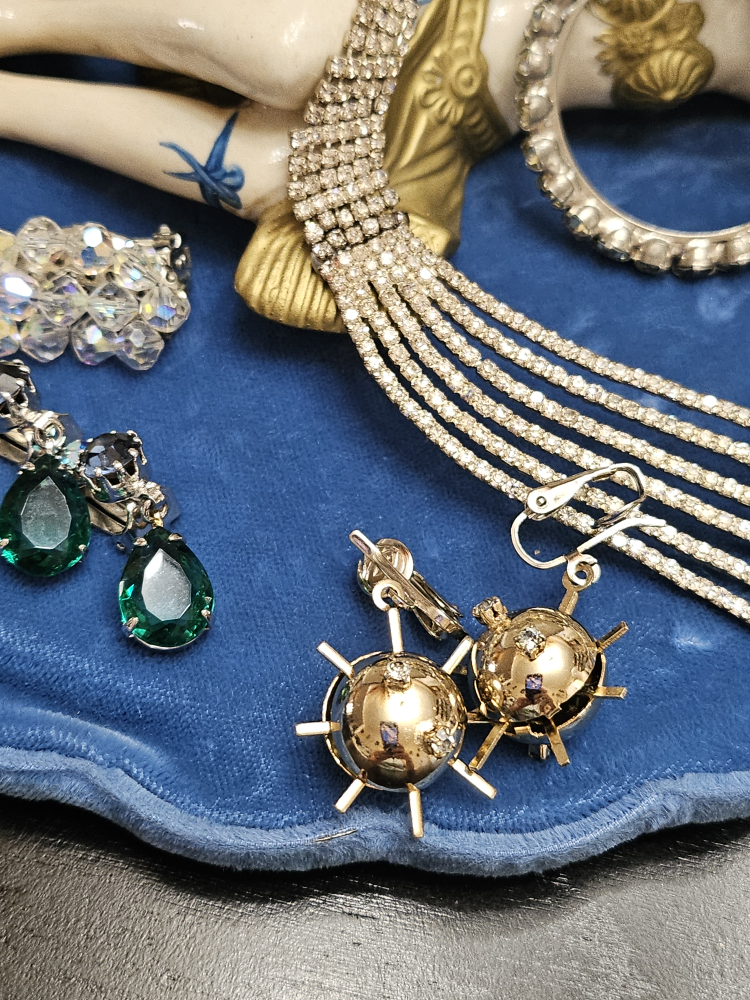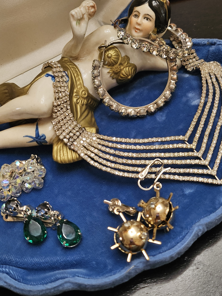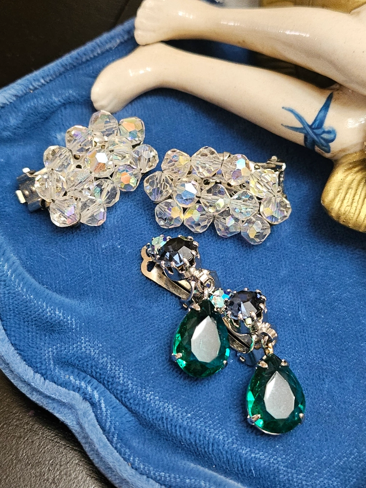 Selling a collection of vintage rhinestone earrings! There are several different styles available, including hoop earrings, clip-on earrings with green stones, and cluster earrings. All are in good vintage condition and ready to add some sparkle to your wardrobe.The Box is not for sale ,the figurine is not for sale