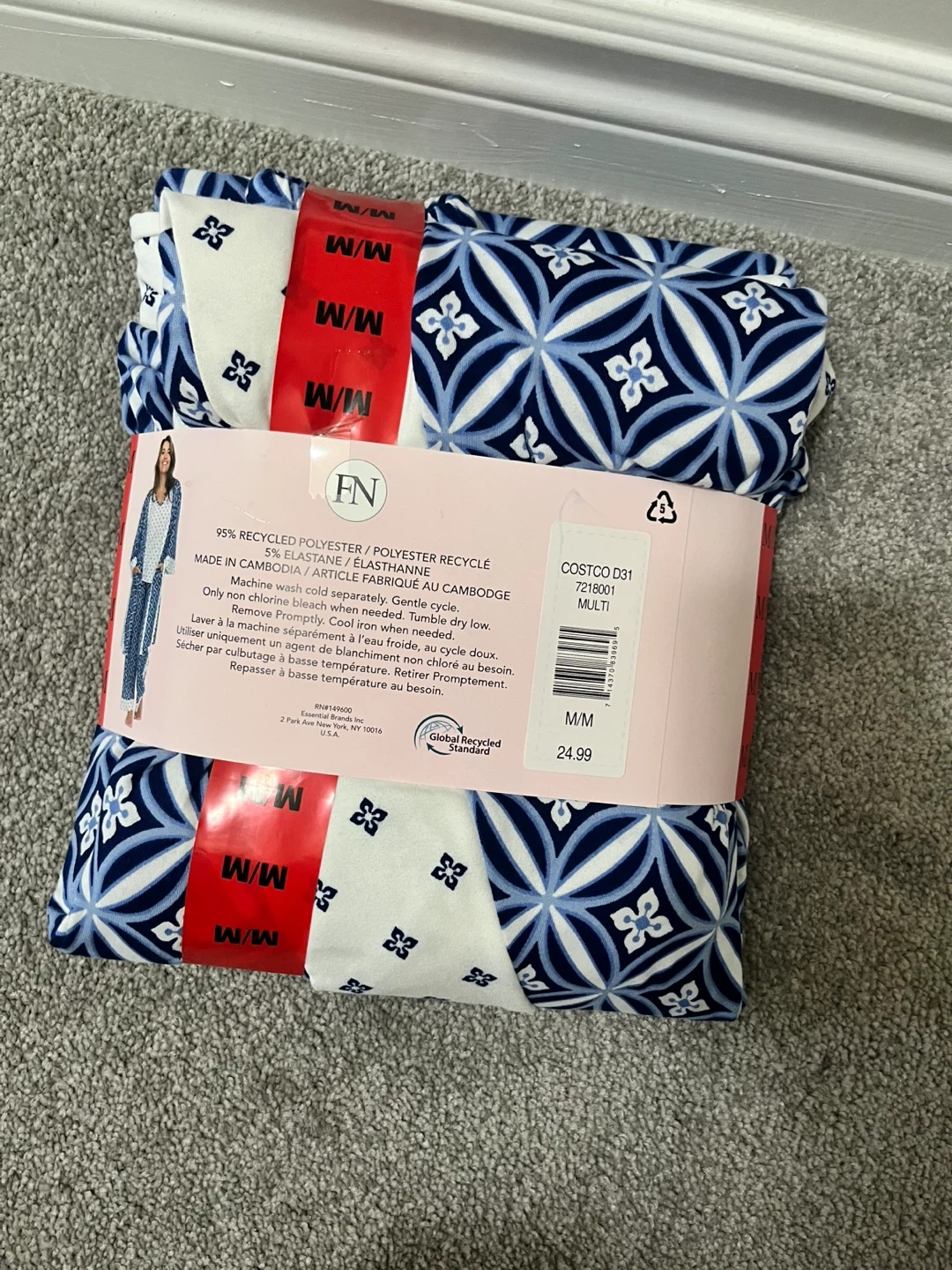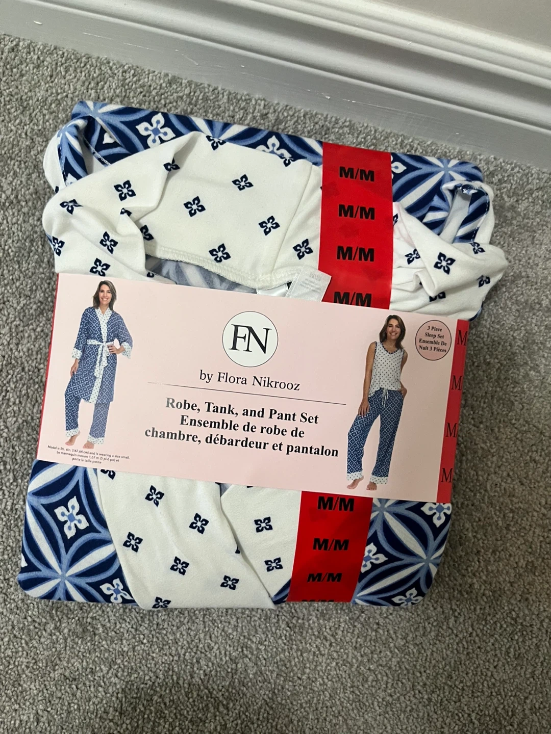 This is a brand new Flora Nikrooz robe, tank, and pant set in size M/M. The set is made of 95% recycled polyester and 5% elastane. It's a 3-piece set that includes a robe, a tank top, and pants. Originally bought for $24.99 at Costco.