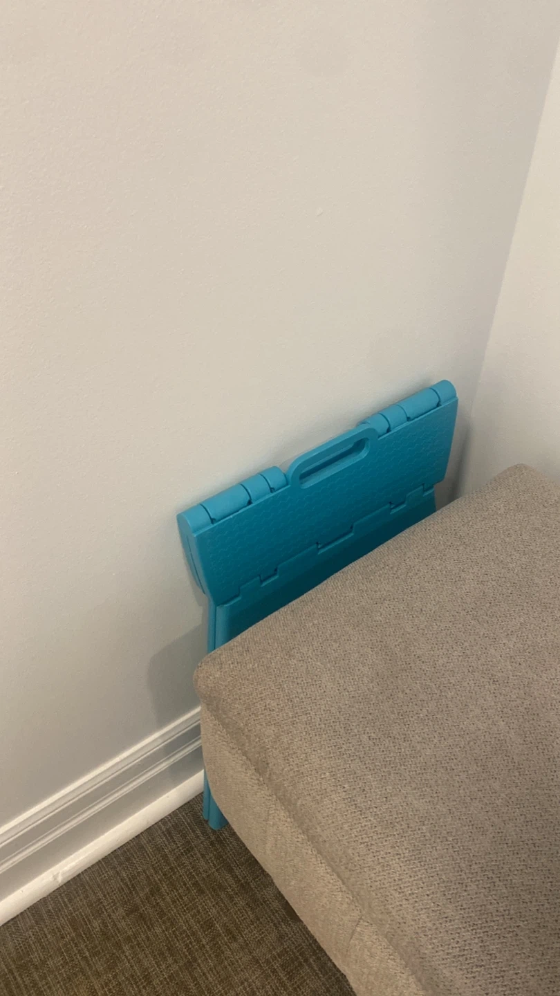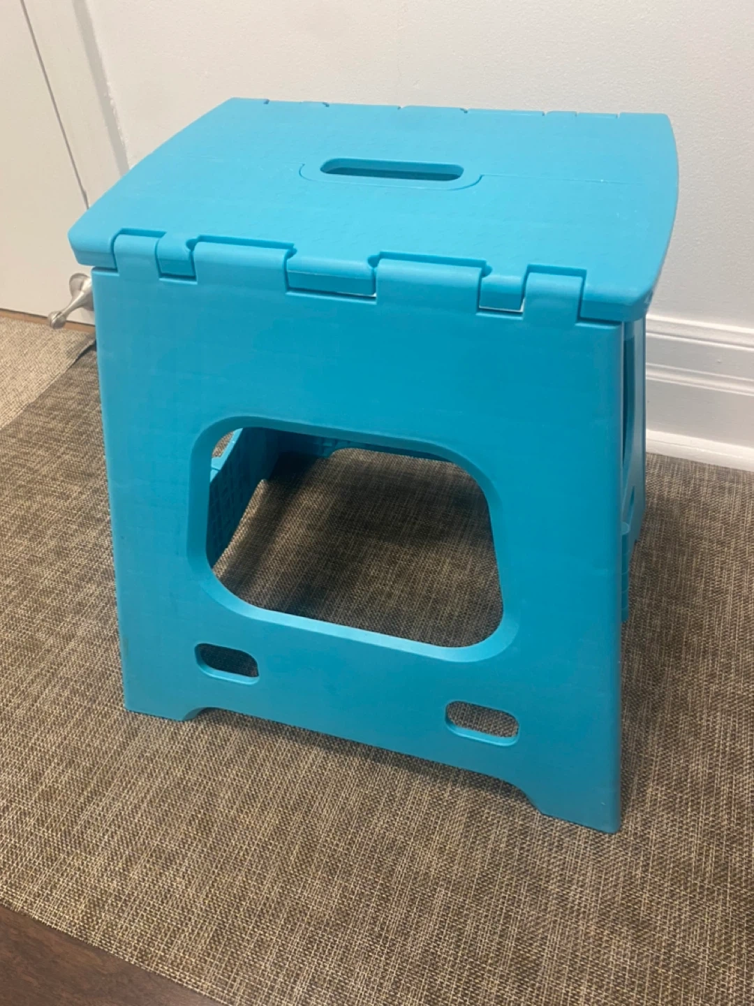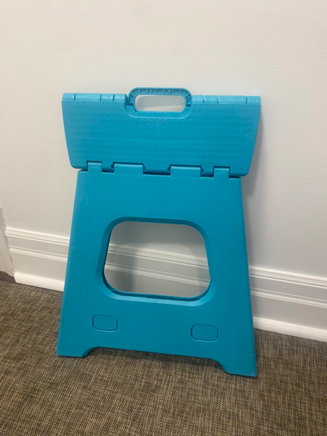 This is a handy blue folding step stool! It's lightweight and easy to store when not in use. Perfect for reaching those high shelves or giving the kids a boost.