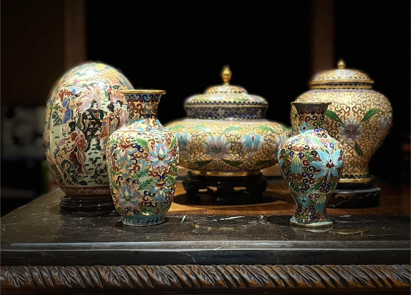 Selling a beautiful set of vintage cloisonné vases and a jar with a lid. These pieces feature intricate floral designs and vibrant colours. They would make a stunning addition to any home decor!