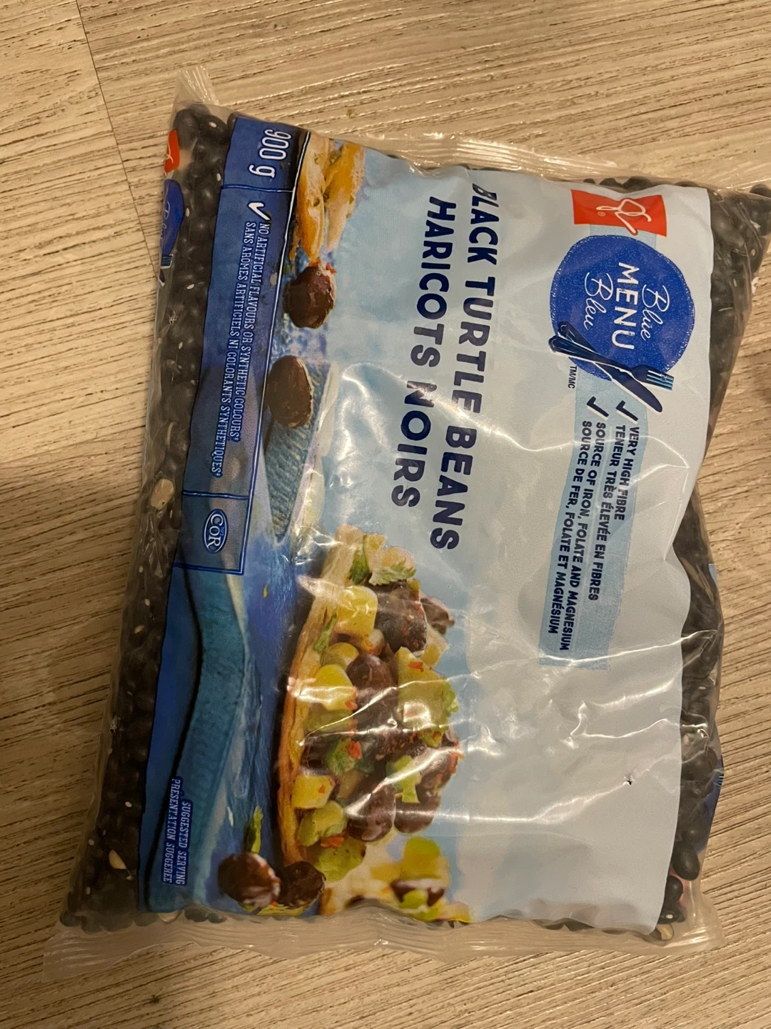 Selling a bag of PC Blue Menu Black Turtle Beans. It's a 900g bag, perfect for making a hearty soup or chili! They are a very high fibre food and a source of iron, folate, and magnesium