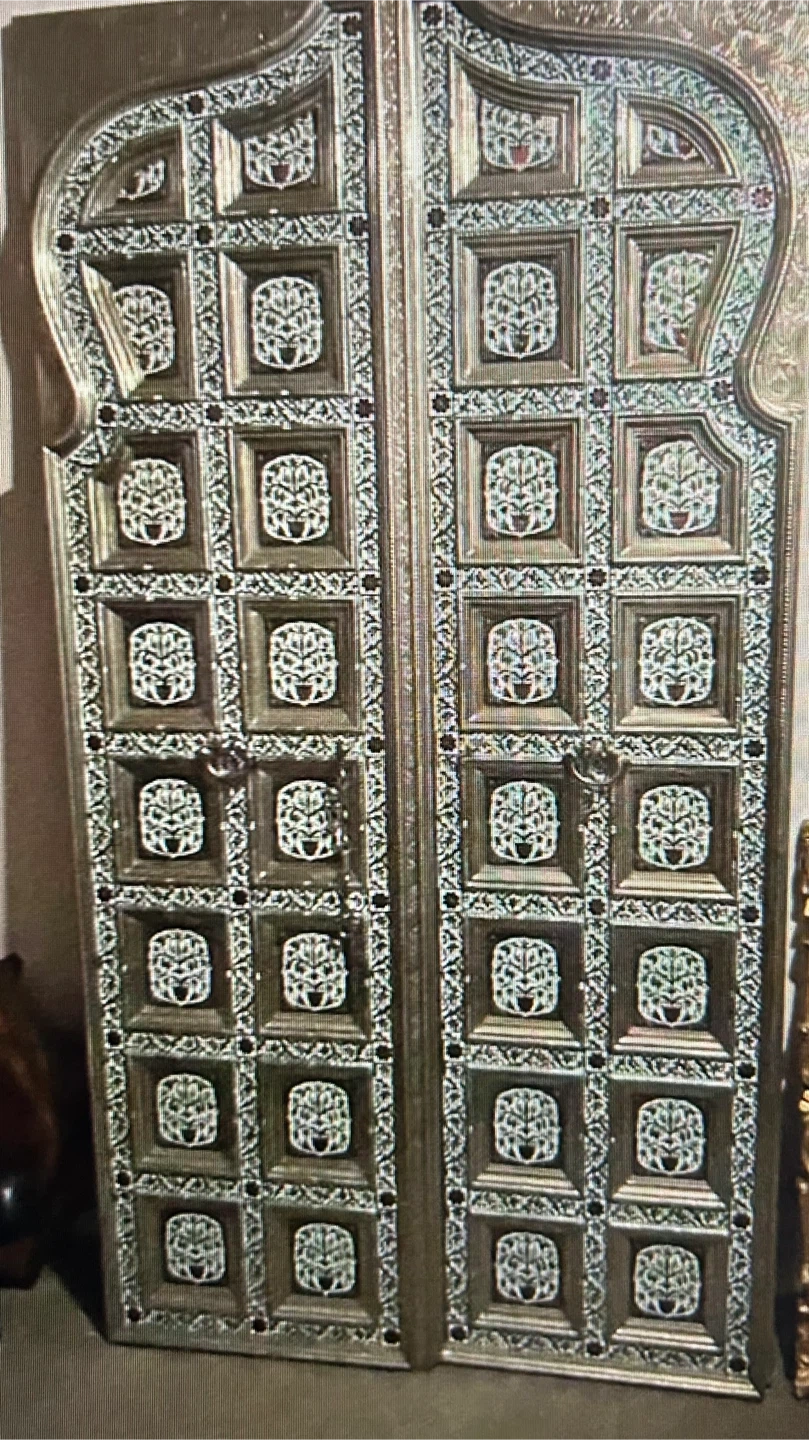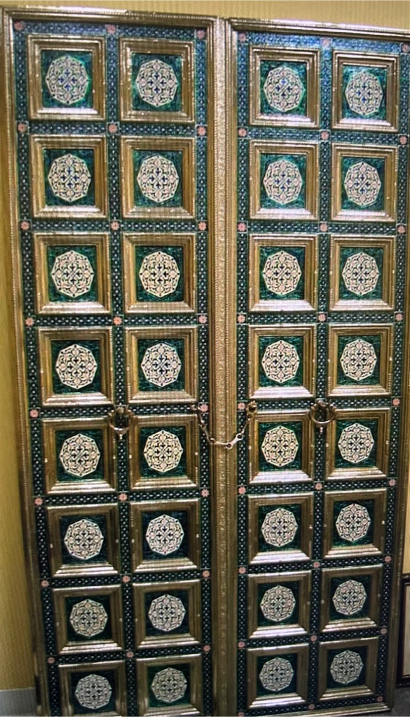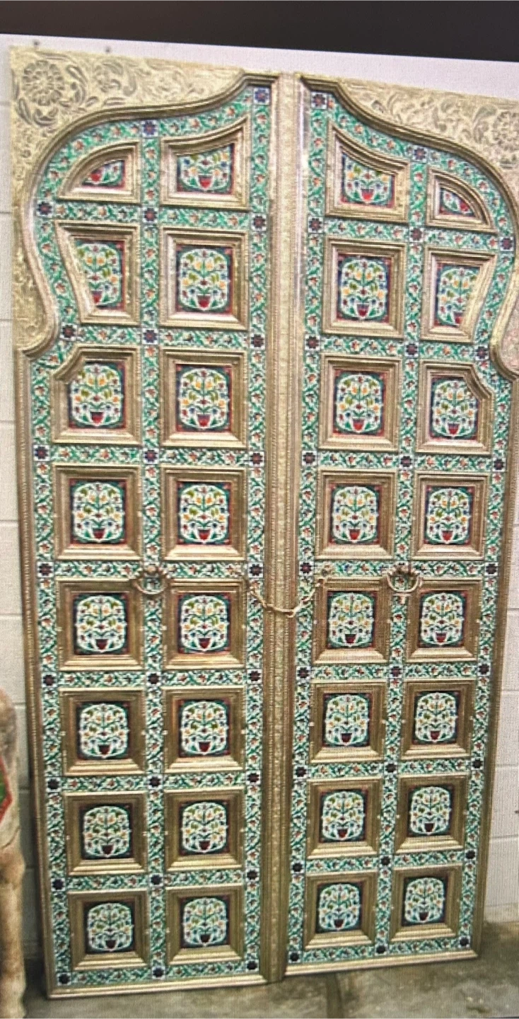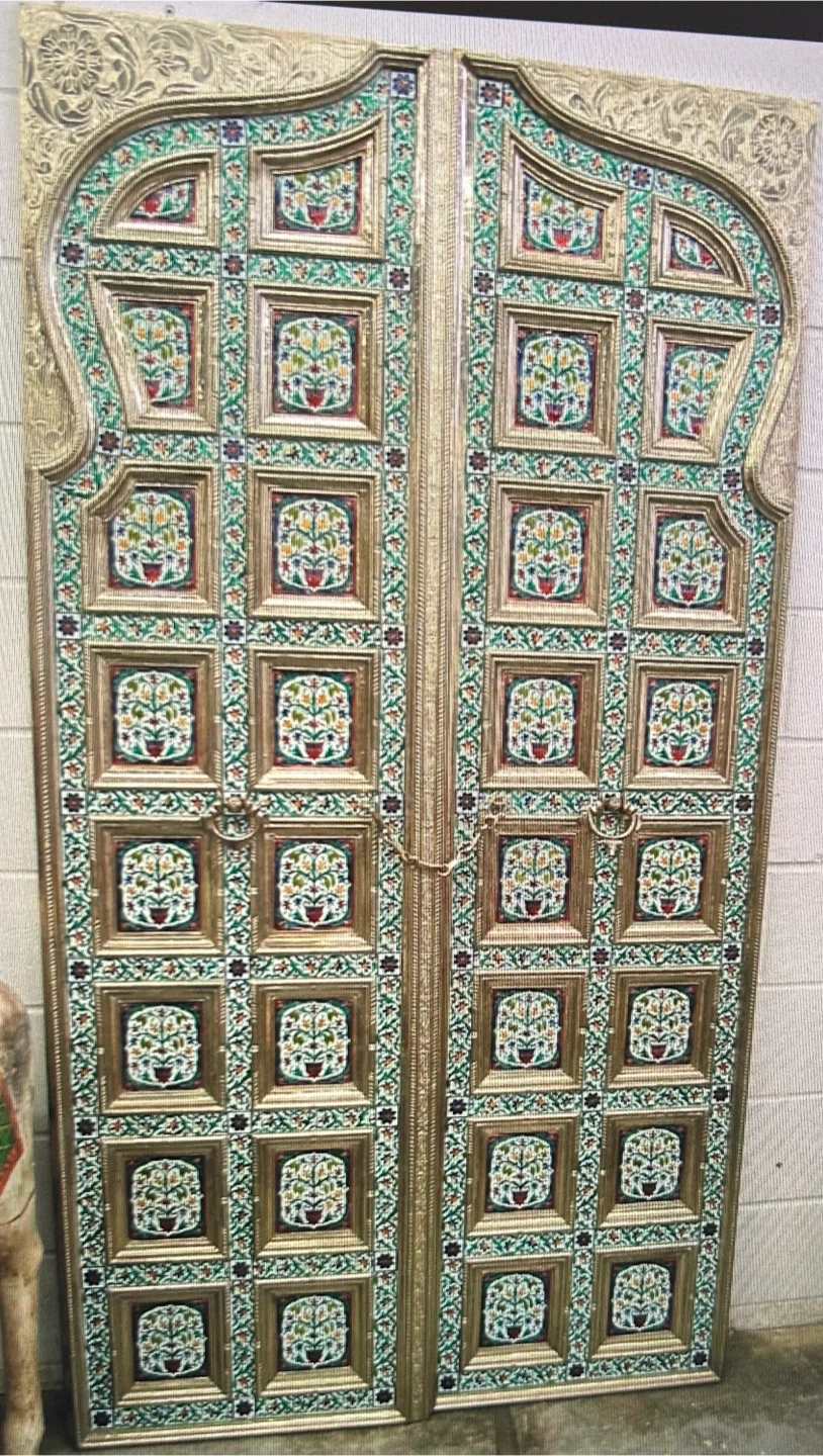 Two set of doors available, each set $3000.00. Beautiful and unique set of double doors with an intricate, decorative design. These doors would make a stunning statement piece in any home. The doors feature a gold-tone frame with colourful square panels and ornate detailing. They have a rustic charm and are perfect for adding a touch of exotic elegance to your space