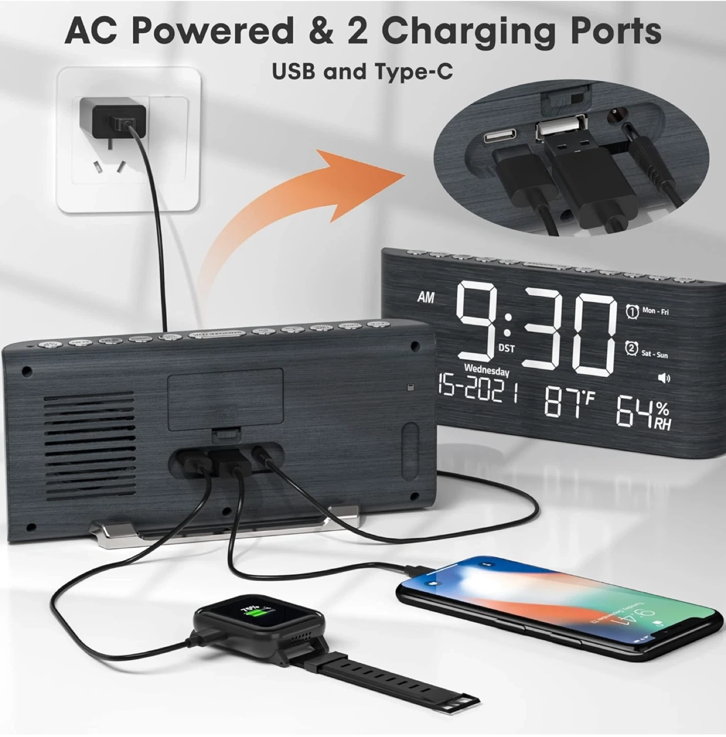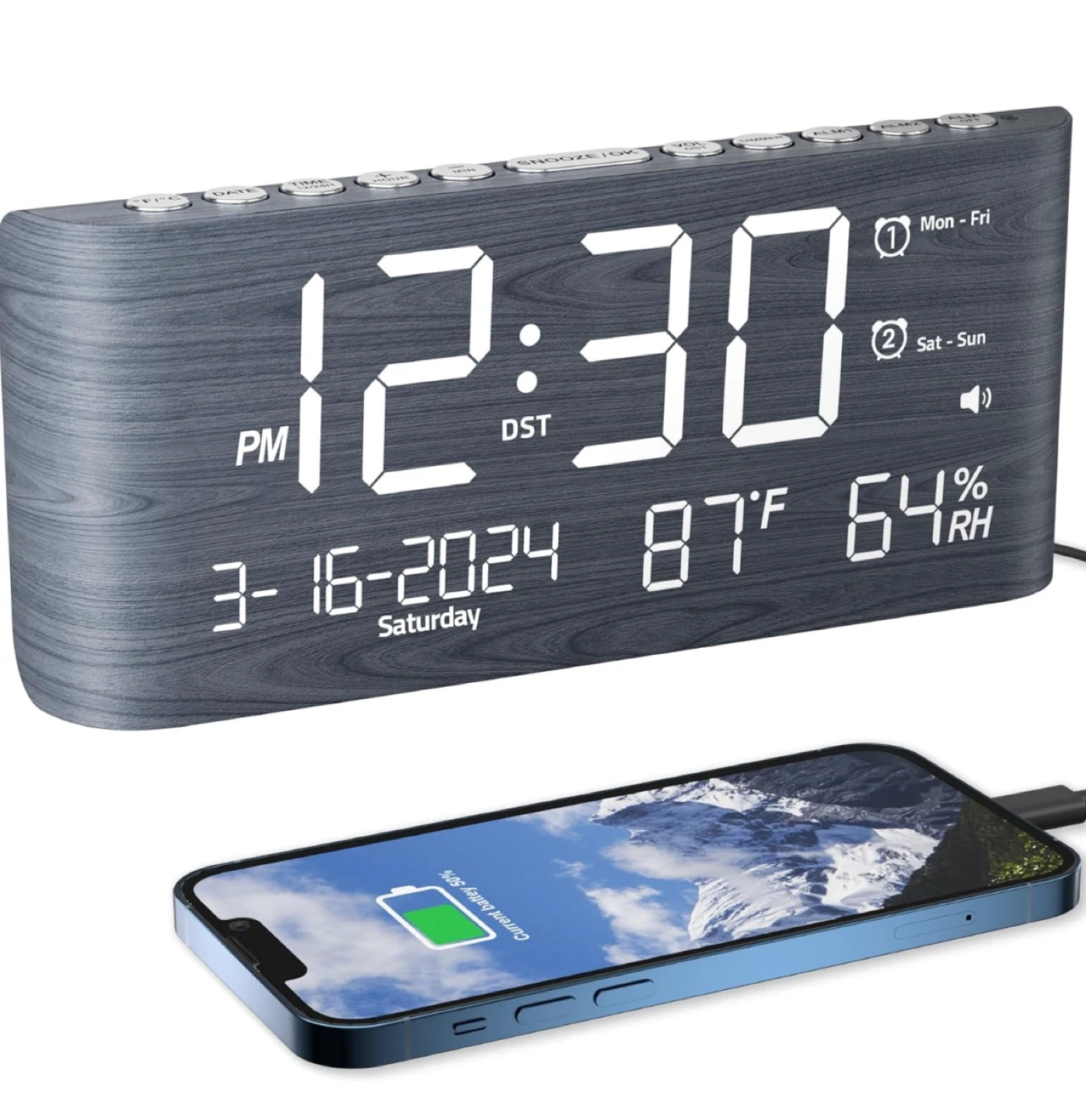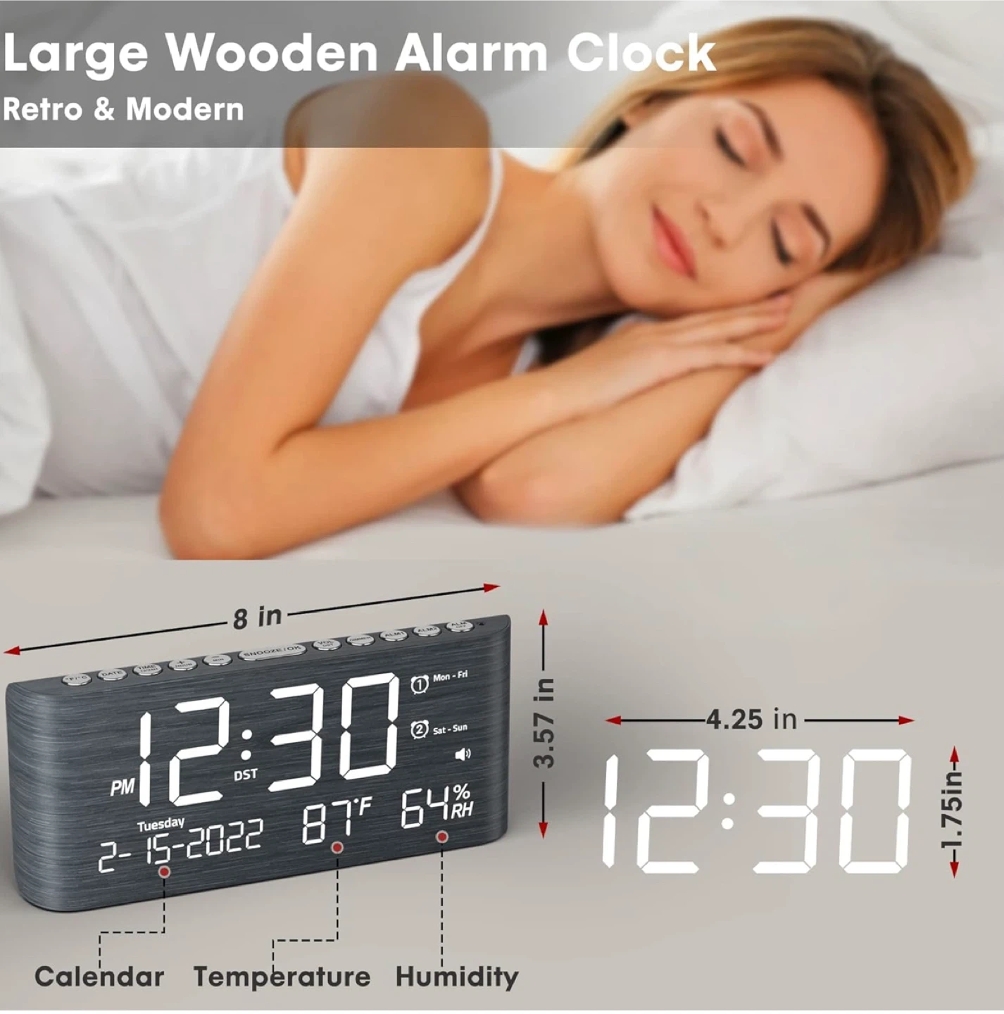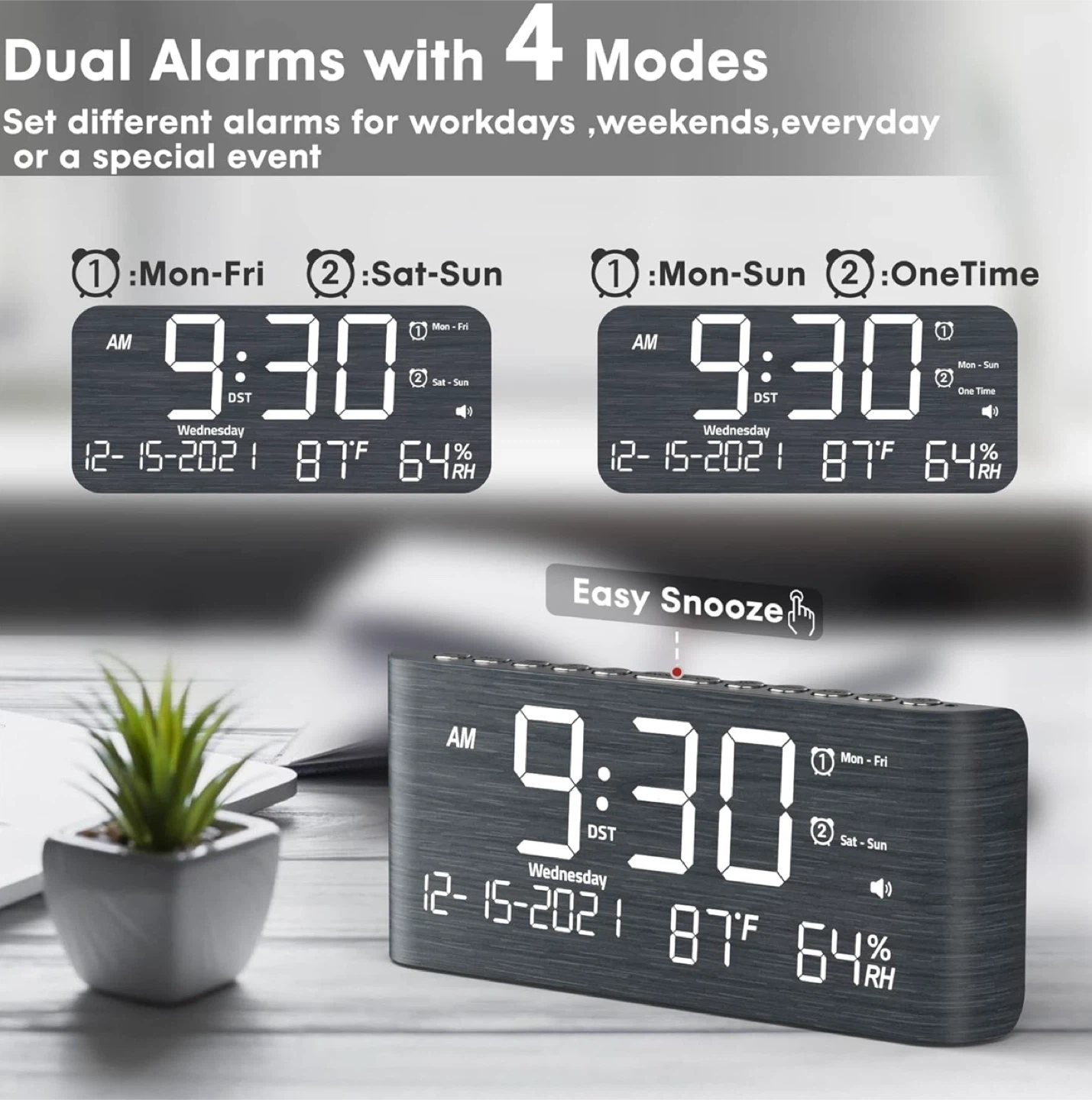 127Sleek wood-grain style digital alarm clock with easy-to-use buttons. Dual alarms and 4 alarm modes. 2 charging ports and battery backup. Includes thermometer (temperature), hygrometer (indoor humidity), calendar showing date and week. With an 8.8'' large display, you can adjust your brightness preference with 5 levels to choose from. In perfect working condition.