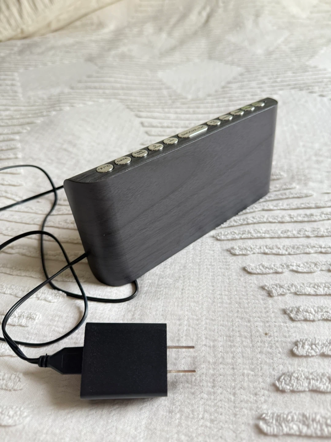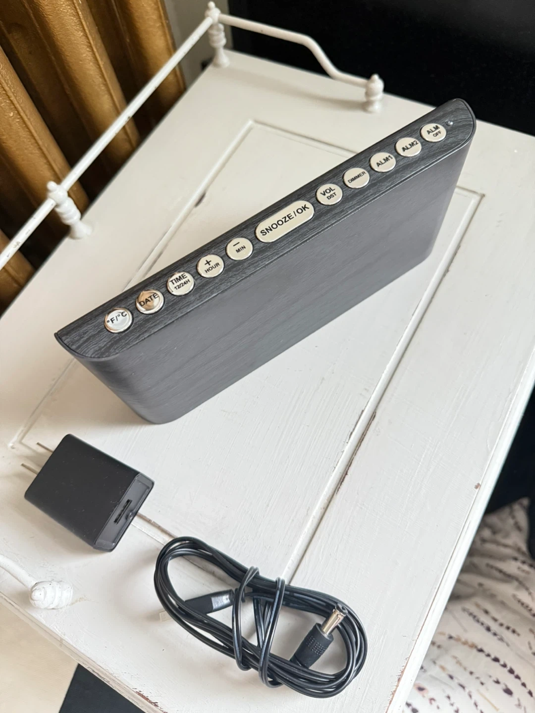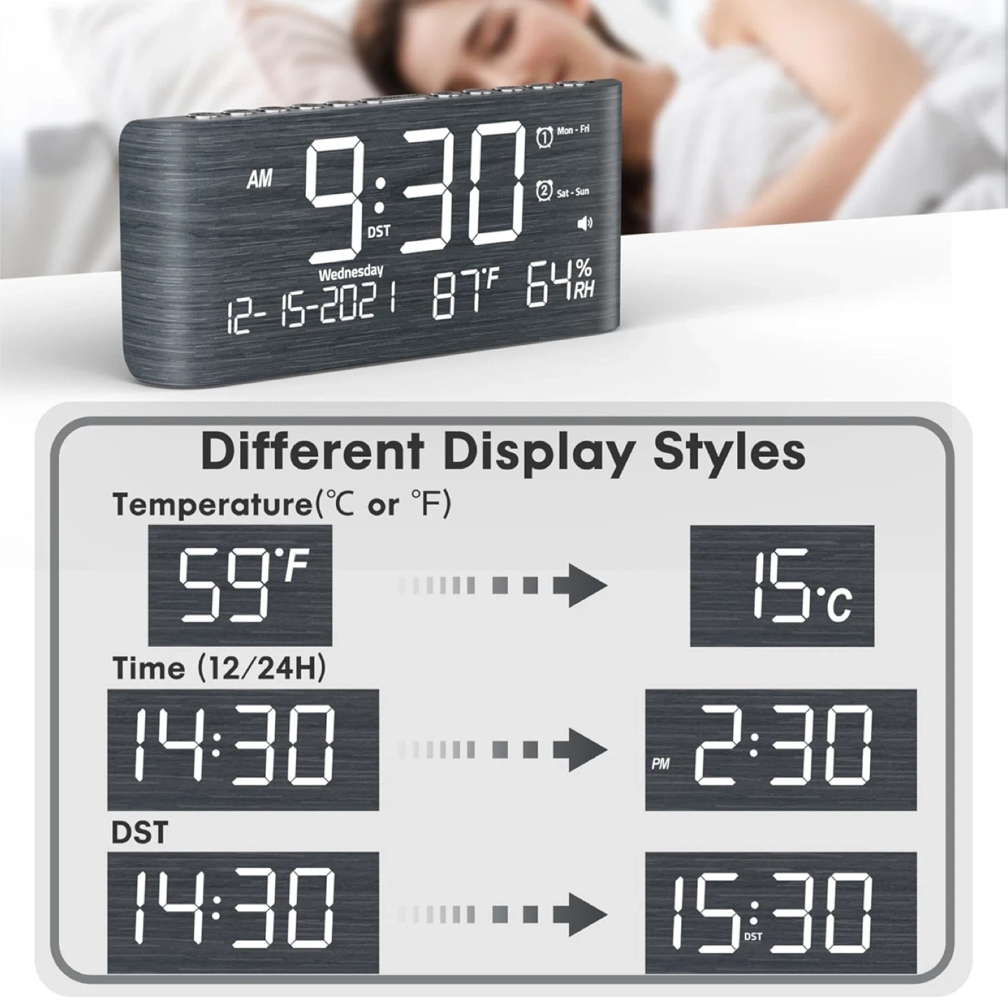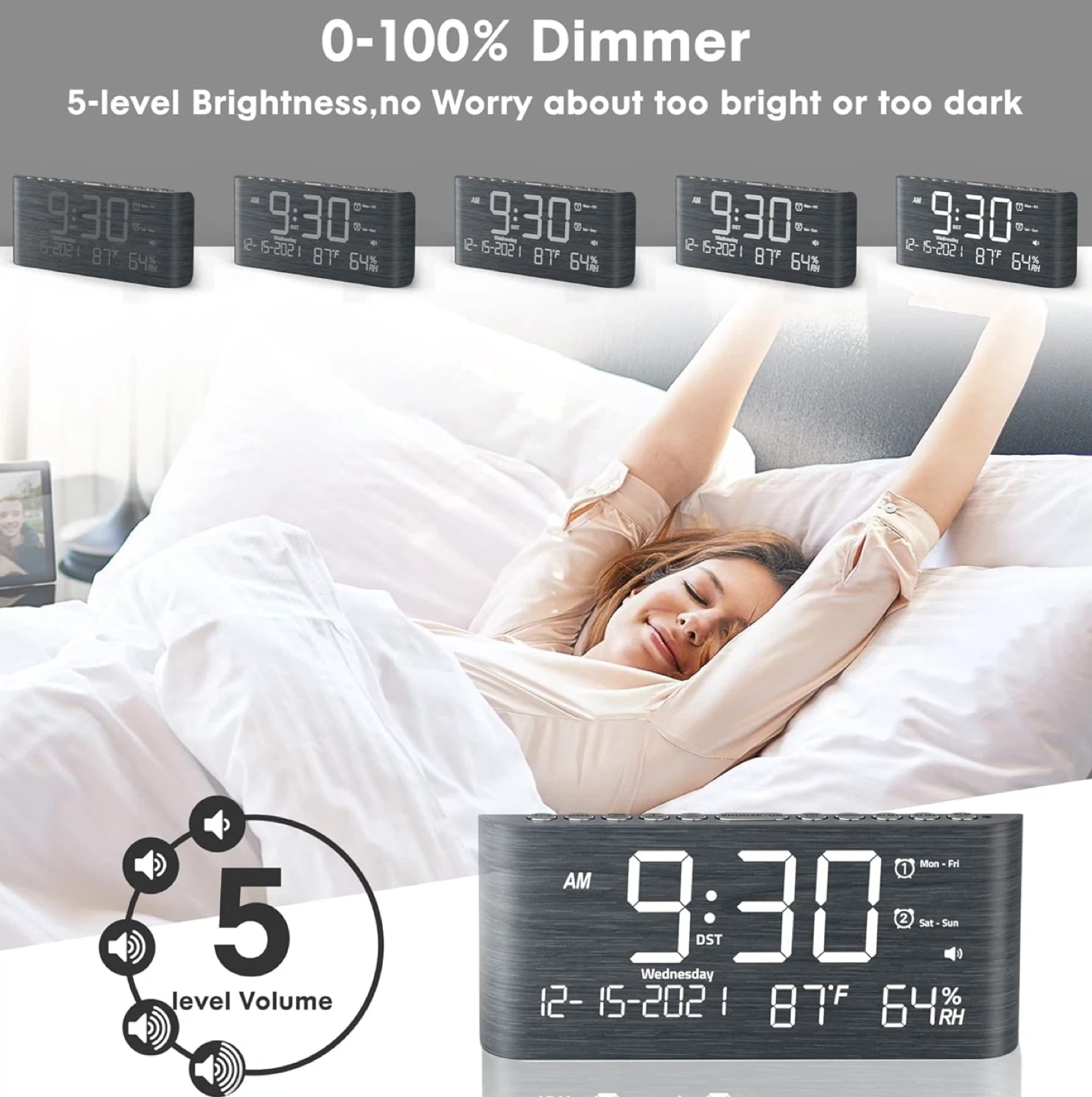 127Sleek wood-grain style digital alarm clock with easy-to-use buttons. Dual alarms and 4 alarm modes. 2 charging ports and battery backup. Includes thermometer (temperature), hygrometer (indoor humidity), calendar showing date and week. With an 8.8'' large display, you can adjust your brightness preference with 5 levels to choose from. In perfect working condition.
