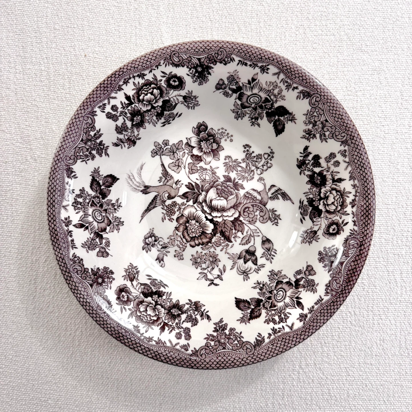 Royal Stafford fine earthenware large serving bowl in the Asiatic Pheasant design, dark brown transferware — this colour is harder to find . No chips, cracks or crazing — pings/rings when tapped. Measures 10.25” diameter x 2.25” high