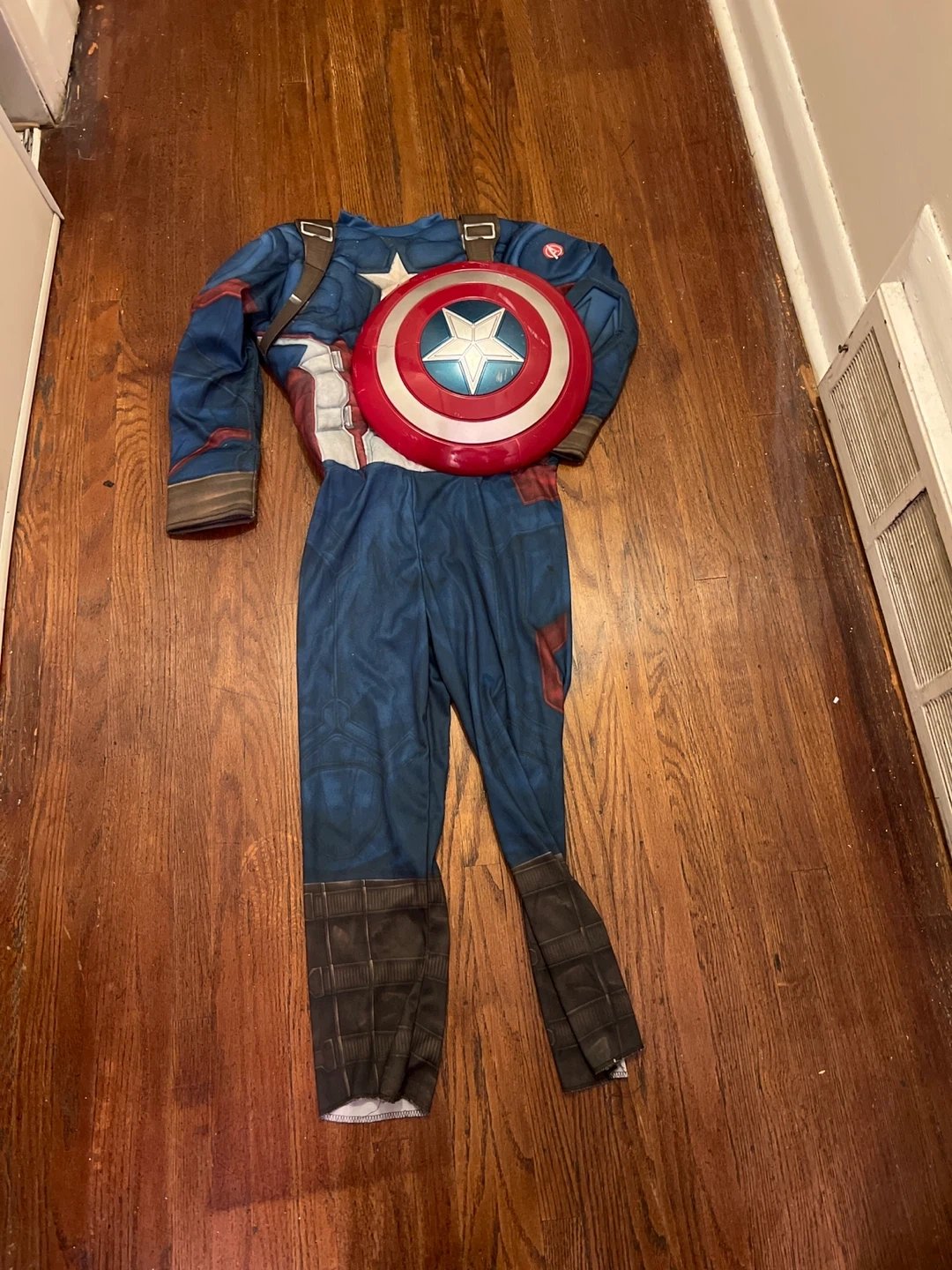 Captain America costume with shield for your little superhero! Great for dress-up or Halloween. In good condition and ready for a new adventure! There are small cracks in the shield