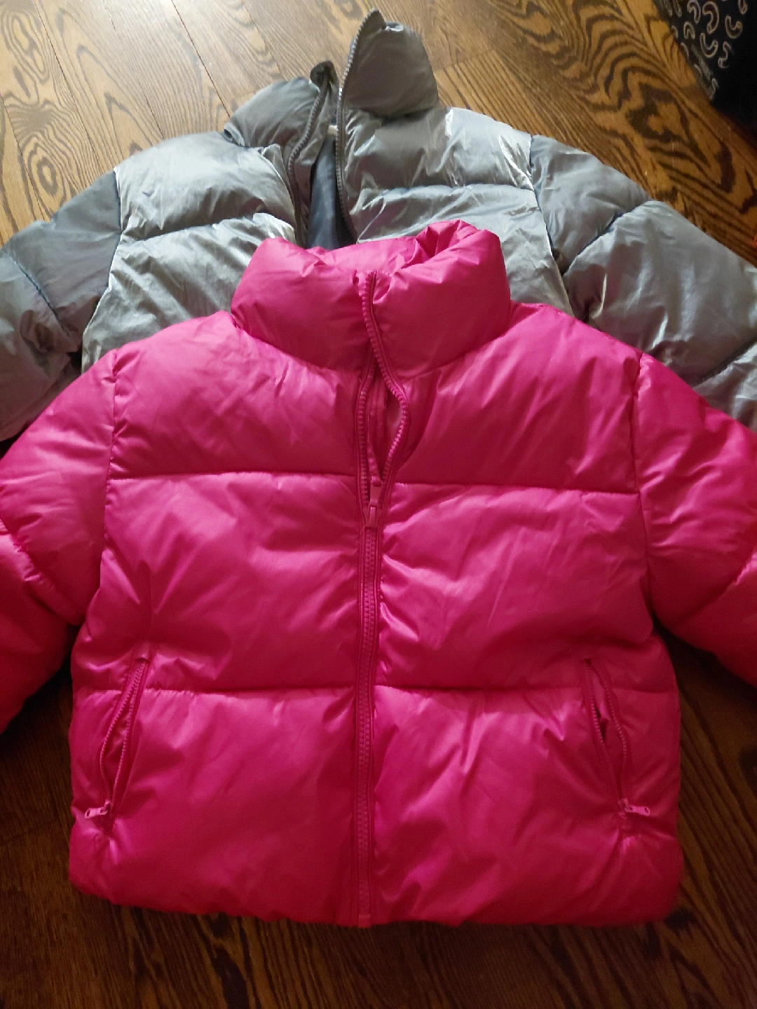 Two puffer jackets for sale! One is a bright pink colour, and the other is a sleek grey. Both are in great condition and ready to keep you warm this winter size is petit and small