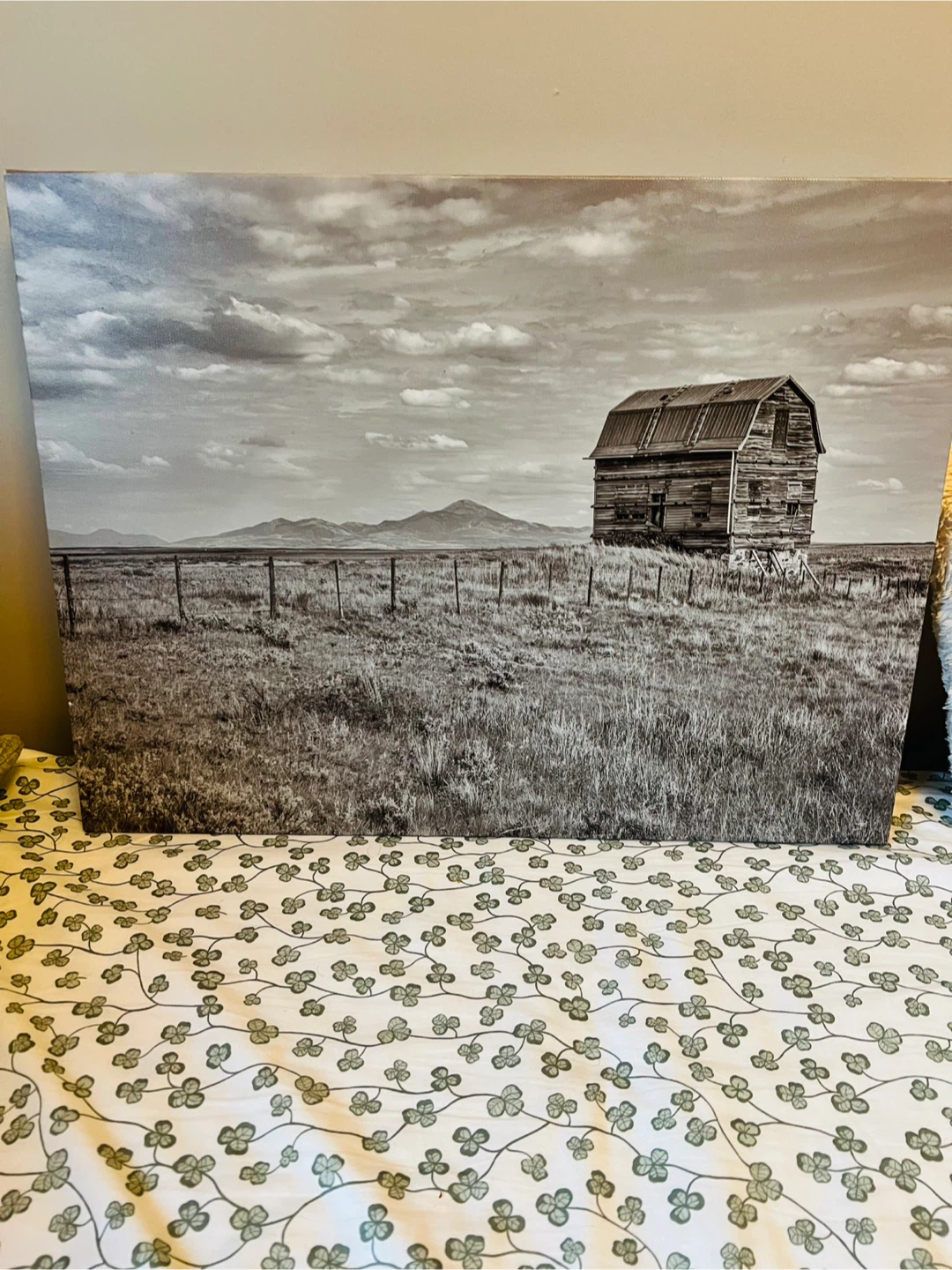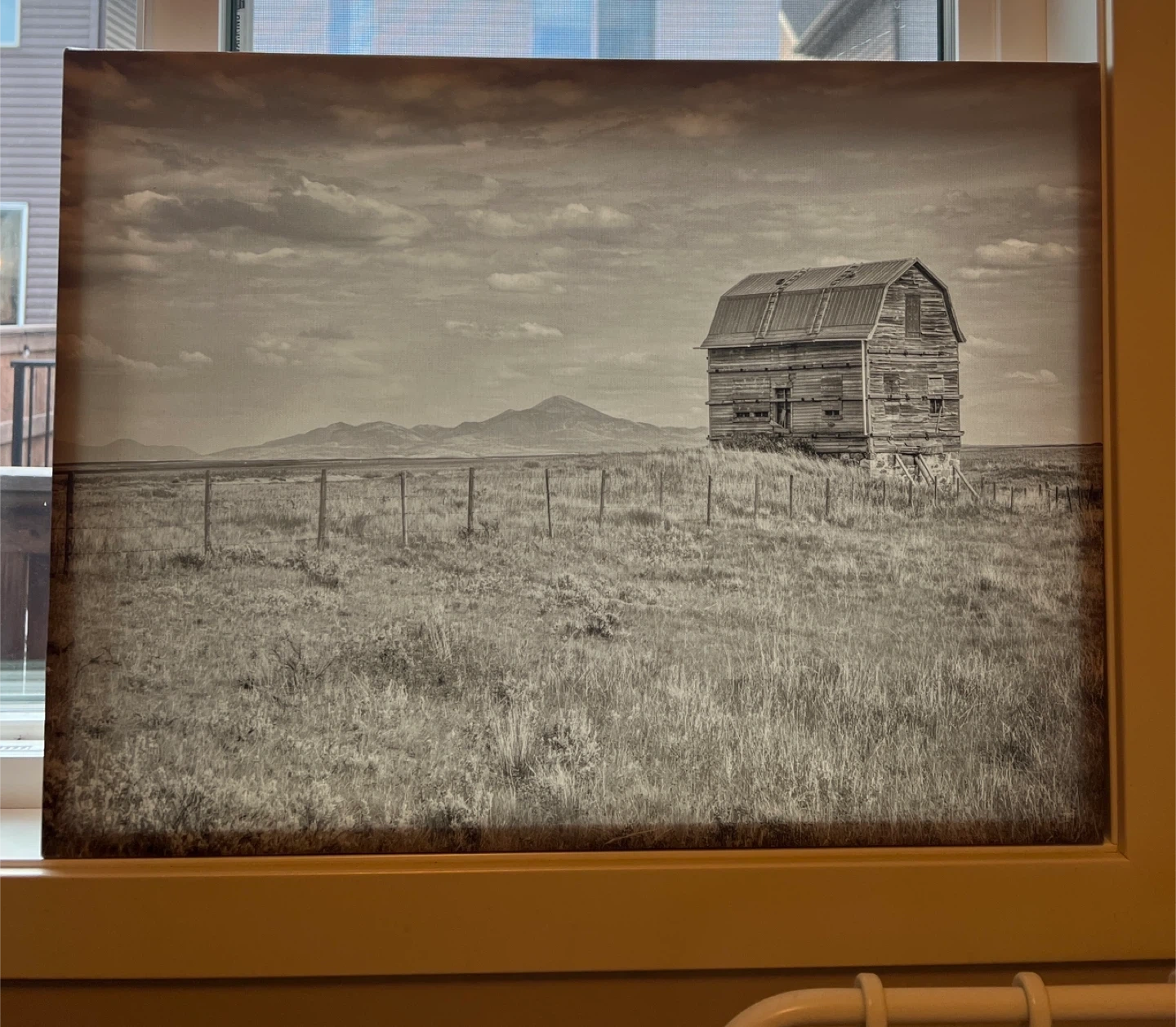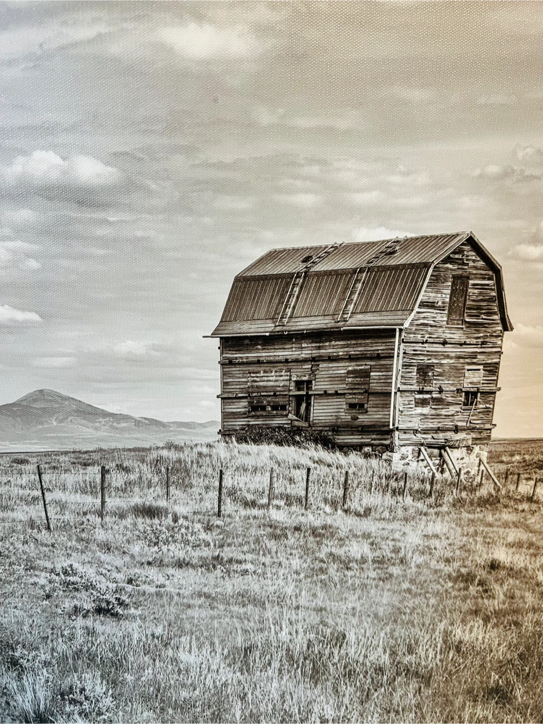 This Homesense art piece features a beautiful black and white landscape of a barn.