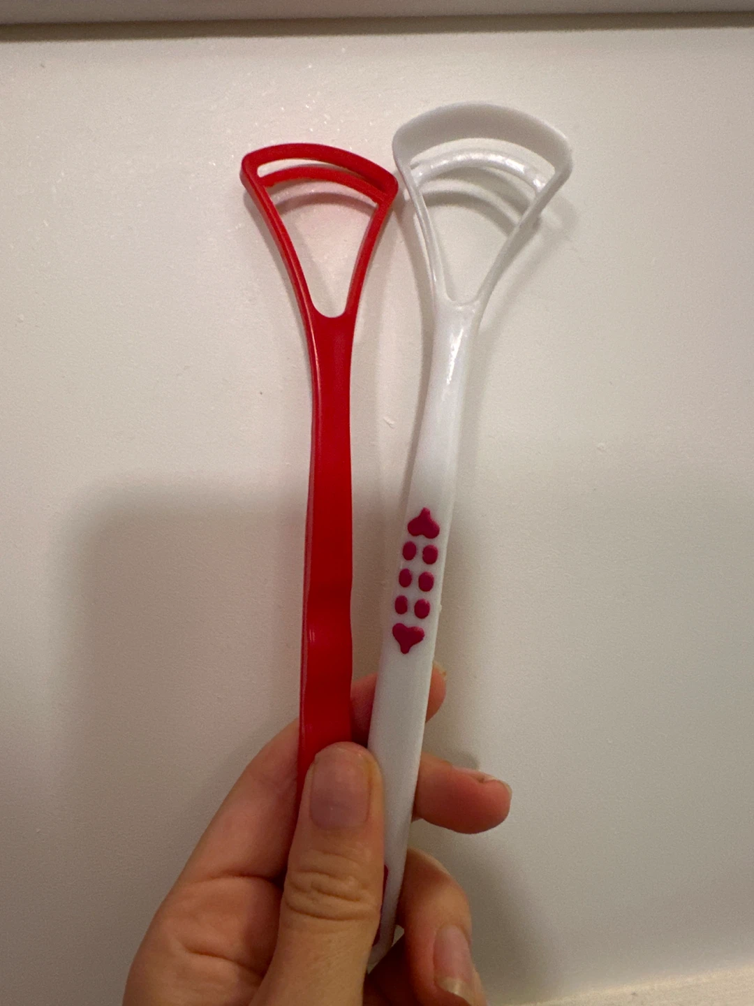 Two tongue scrapers for sale! One is red and the other is white with pink paw prints. Great for oral hygiene