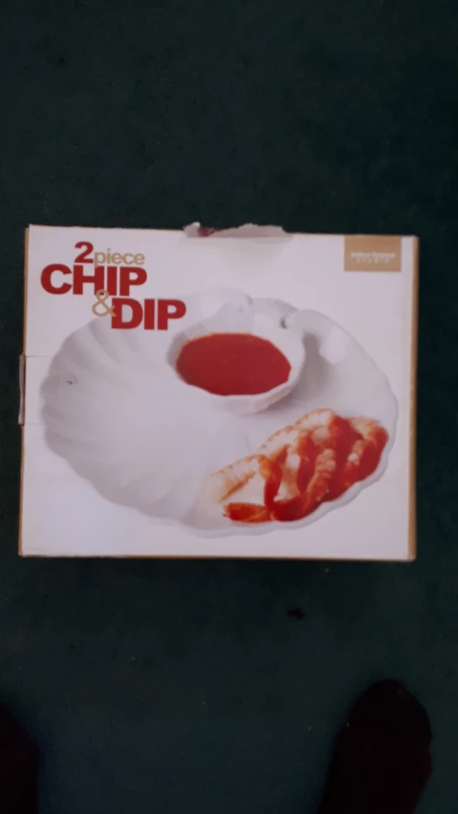 I have a brand new, never-used 2-piece chip and dip serving set. It's perfect for entertaining or adding a touch of elegance to your snack time. The set includes a large chip bowl and a smaller dip bowl, both in a stylish design. The box is included too!