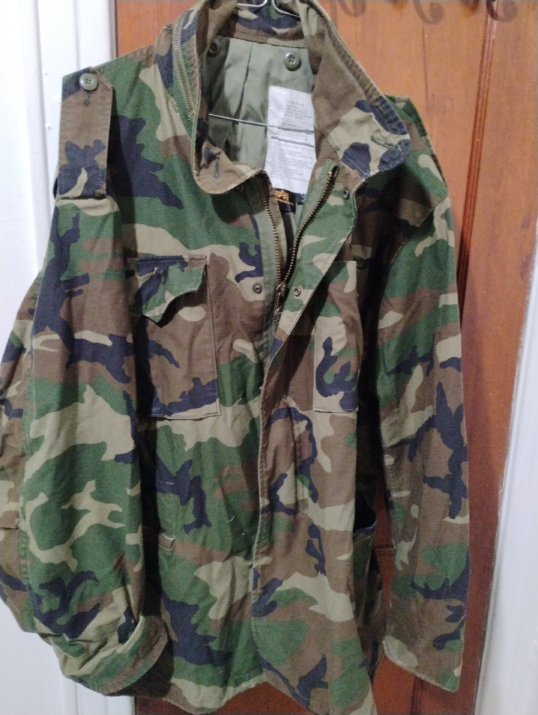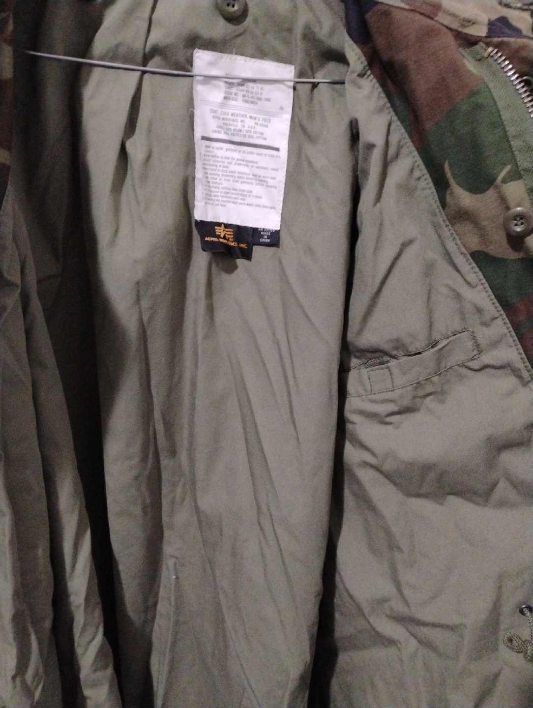 Selling an Alpha Industries M-65 field jacket in a camouflage pattern. It's a classic and durable jacket, Good condition