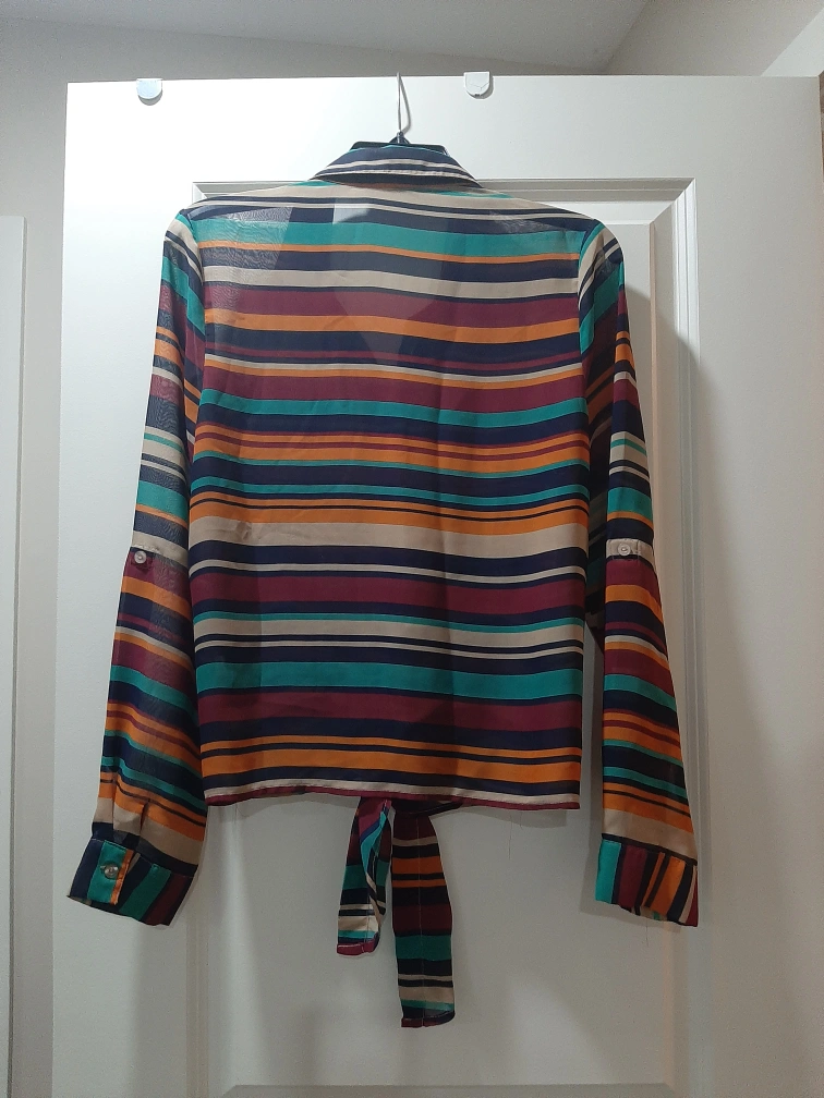 Here's a colourful striped long-sleeve blouse! It features a mix of teal, orange, beige, and burgundy stripes. It's a size medium and in great condition. Perfect for adding a pop of colour to your wardrobe!
