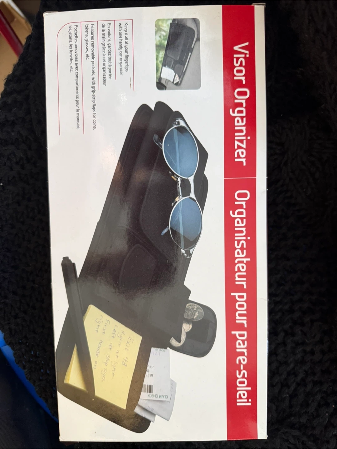 10Keep your car tidy with this handy visor organizer! It features pockets for your pens, glasses, and more. It also has removable pockets with grip-strip flaps for coins, tokens, and other small items. It's in great condition and comes with the original box
