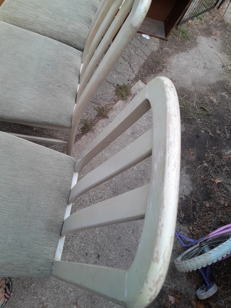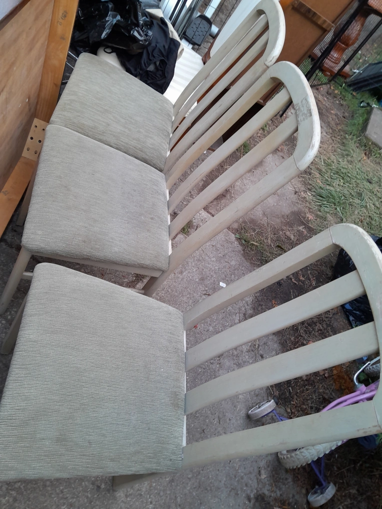 Selling a set of three vintage dining chairs. They have a unique design and would look great in a dining room or kitchen. The chairs show some signs of wear, which adds to their vintage charm