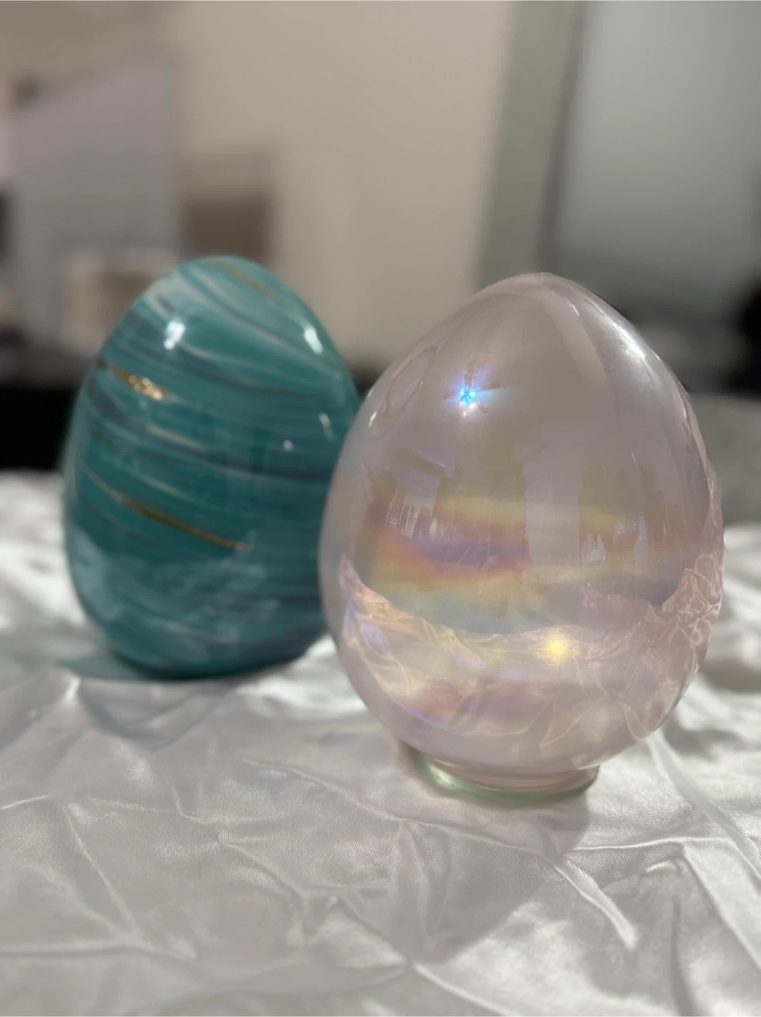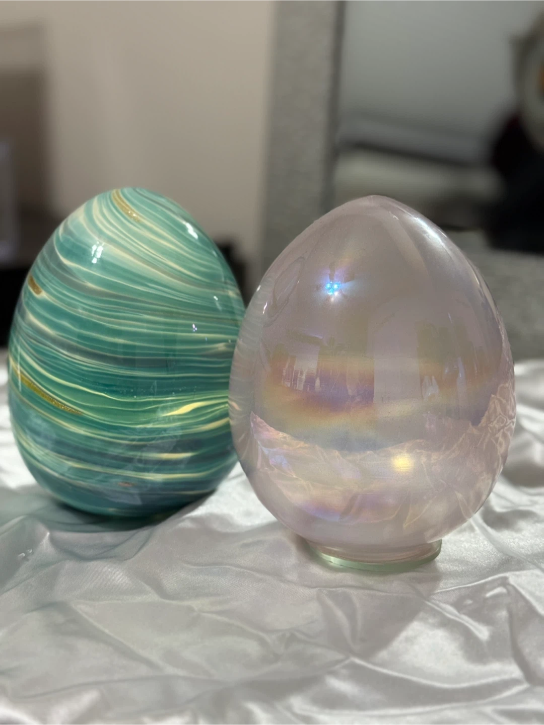$15 for both. Two decorative glass eggs. Teal egg features swirling design with gold accents and has a switch on the bottom that lights it up. Light pink egg shows iridescent colouring. Both have a flat bottom. Pick up in SE Mapleridge near Acadia