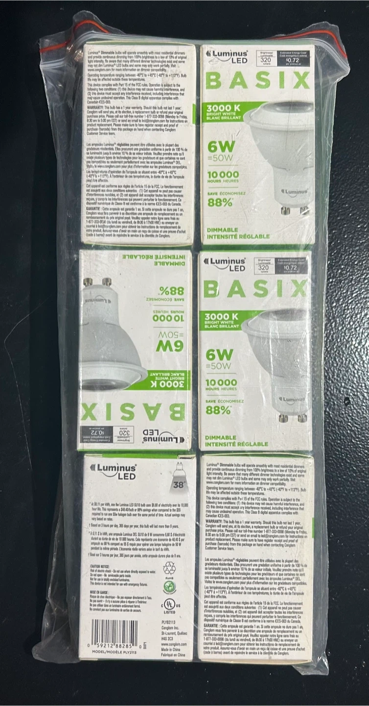 201I'm selling a Lot of 6 new Luminus LED Basix light bulbs. These are 6W bulbs, equivalent to 50W, with a bright white 3000K light. They're dimmable and designed to save up to 88% on energy costs. Each bulb has a long lifespan of 10,000 hours. Model/Modèle PLY2113