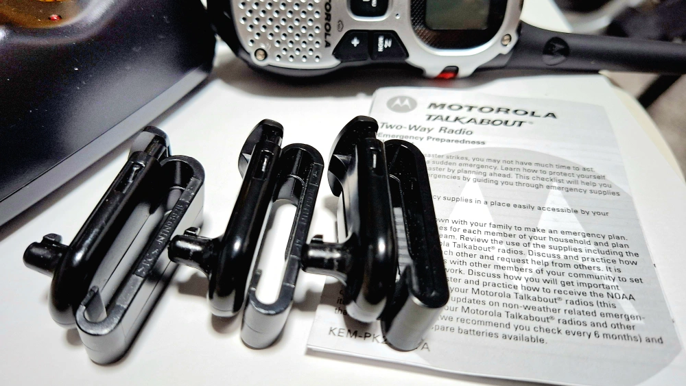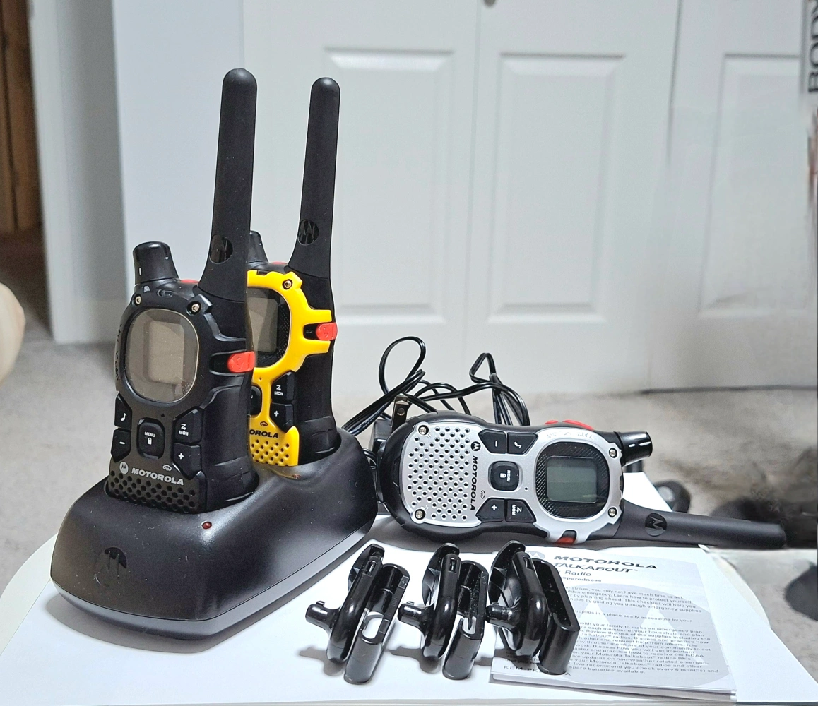 Selling a set of (3 pieces) Motorola Talkabout two-way radios. They're in like new condition and come with the charging base and belt clips. Perfect for staying connected on outdoor adventures or during emergencies! Includes the instruction manual as well