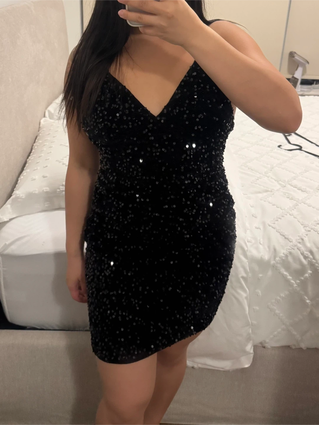 Selling a cute black velvet sequin mini dress! It's perfect for a night out or a special occasion. The dress features a V-neckline and a bodycon fit. It's in great condition, ready for a new home