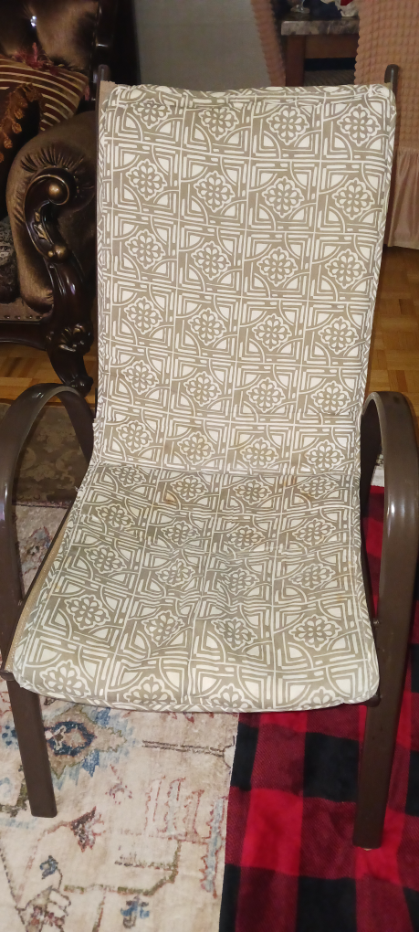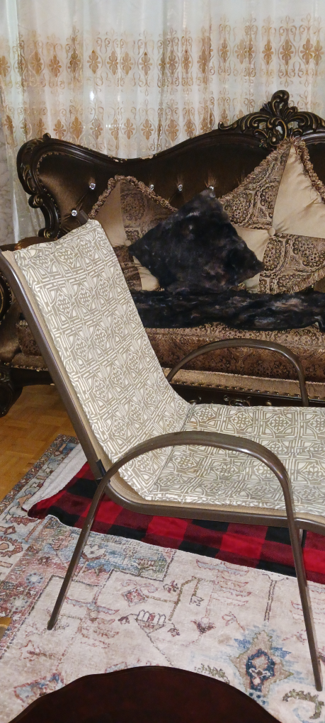 Here's a comfy vintage patio chair with a brown metal frame and patterned fabric seat and back. It's perfect for relaxing on your porch or deck. The chair has a unique design and is ina very good condition. It would make a great addition to any outdoor space! you can put in the living room too. The chair's fram has no skrach